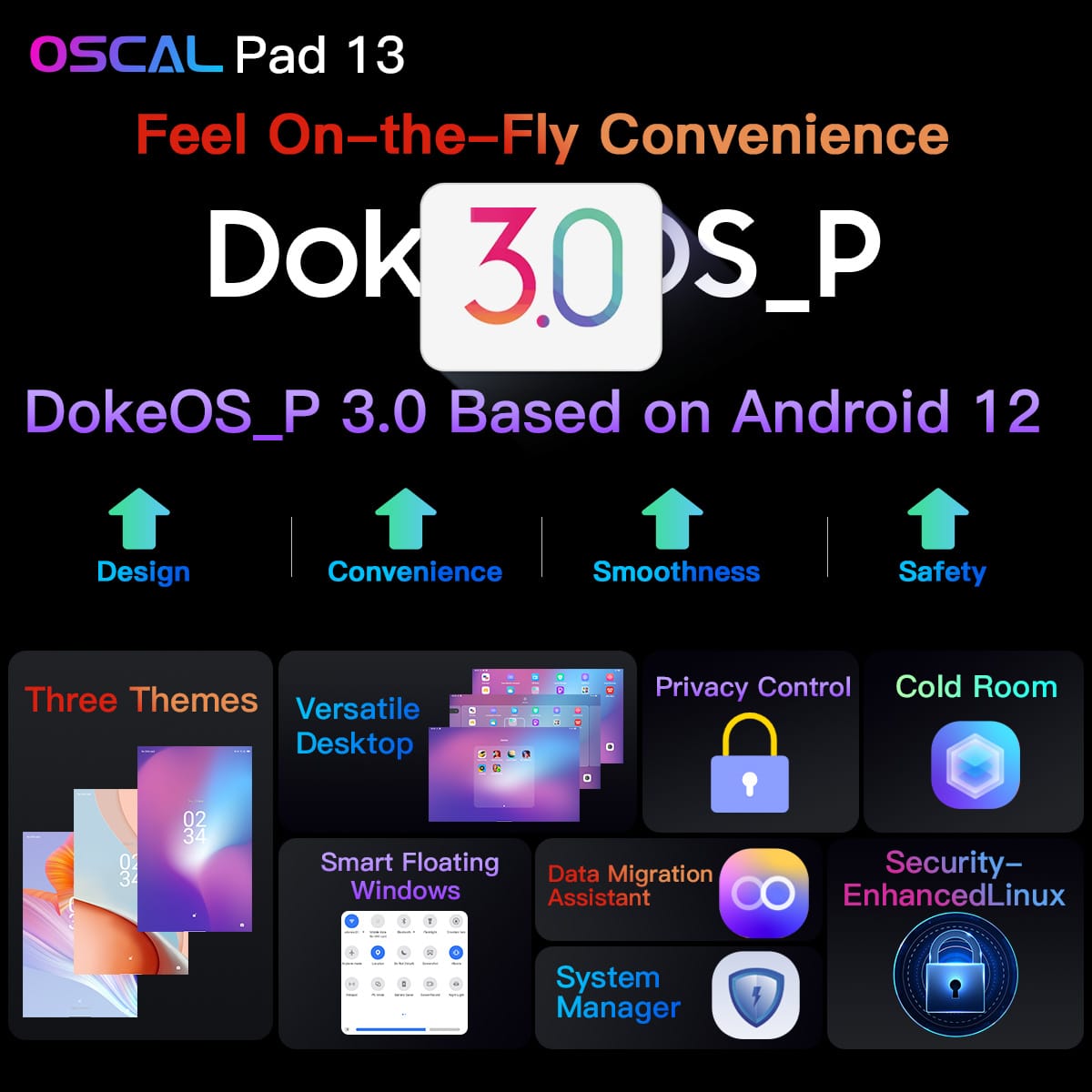 Co se týče samotného chodu zařízení, v tomto případě se vsází na oblíbený operační systém Android 12. Co je však ale o to důležitější, je jeho nadstavba DokeOS_P 3.0, která celé zařízení posouvá o hned několik kroků vpřed! Nabízí se proto klasická okna, maximální důraz na soukromí a zabezpečení či jednoduchý správce systému. Tablet lze také v okamžiku přepnout do všestranného PC režimu, díky čemuž se můžete ihned a naplno ponořit do práce. Nechybí totiž podpora myší a klávesnic, stejně jako možnost dotykového ovládání. Součástí balení je navíc i dotykové pero. Za zmínku pak také stojí funkce pro rozdělení obrazovky, což vám může usnadnit multitasking.