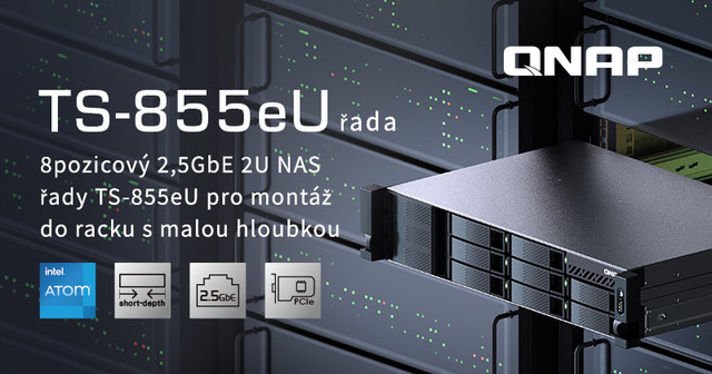 Tisková zpráva: Společnost QNAP® Systems, Inc., přední inovátor v oblasti výpočetních, síťových a úložných řešení, představila řadu NAS 2U s malou hloubkou – TS-855eU. Ta zahrnuje model TS-855eU s jedním napájecím zdrojem a model TS-855eU-RP s redundantními napájecími zdroji. Řada NAS TS-855eU v rackovém provedení s malou hloubkou je mimořádně vhodná pro nasazení v malých skříních, prostorných firemních pracovištích nebo výrobních linkách. Robustní a funkčně bohatá řada TS-855eU, poháněná 8jádrovým procesorem Intel® Atom® C5125 s frekvencí 2,8 GHz a technologií Intel® QuickAssist a podporující až 64 GB paměti DDR4 paměti (s podporou paměti ECC), nabízí osm pozic pro disky SATA a dva porty 2,5GbE. Díky těmto a dalším přednostem splňuje požadavky podnikových souborových serverů, virtuálních počítačů, zálohování SaaS a virtualizačních aplikací, co se týče výkonu a kapacity.