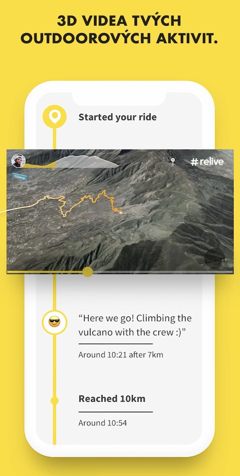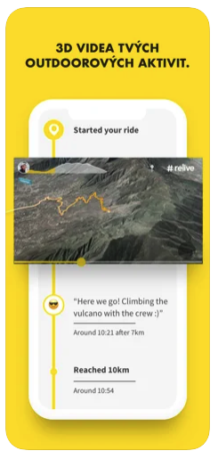 Pokud chcete mít především stylovou vzpomínku na váš cyklovýlet, pomůže vám s jejím pořízením aplikace Relive. Ta totiž umí prakticky z jakékoliv venkovní aktivity vytvořit působivou 3D mapu s animací vaší trasy, fotografiemi, videi nebo podrobnostmi o vašich úspěších. Video můžete následně sdílet dle libosti.