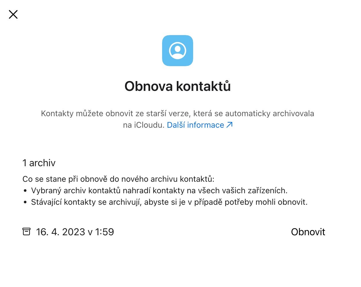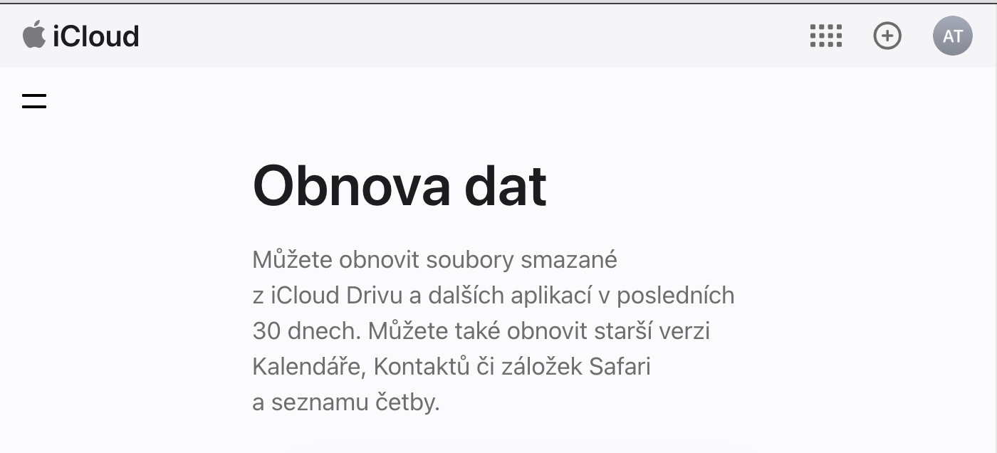 Pokud omylem smažete důležitý obsah, máte možnost jej z iCloudu za určitých podmínek obnovit. Pro obnovení dat z iCloudu na webu přejděte na web iCloud.com a přihlaste se k vašemu Apple ID. Zamiřte zcela dolů a klepněte na Obnova dat. Zobrazí se vám přehled dat, která jste smazali v průběhu uplynulých 30 dní. Vám stačí jen kliknout na vybranou položku a poté na tlačítko Obnovit.