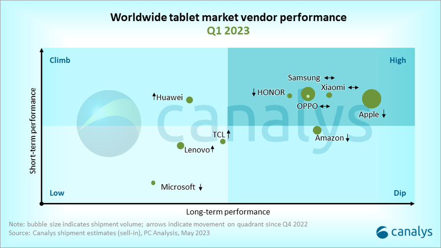 Společnost Canalys uvádí, že dodávky tabletů celosvětově klesly o 18 % v prvním čtvrtletí roku 2023 na 31,7 milionu kusů, přičemž iPady na tom byly jen o něco málo lépe. Manažer výzkumu ve společnosti Canalys, Himani Mukka se k tomu vyjádřil slovy: „Pokles poptávky po tabletech se po svátcích očekává vždy, ale tentokrát bylo omezení spotřebitelských výdajů v prostředí vysoké inflace kritické.“