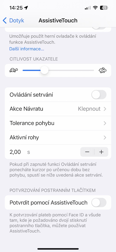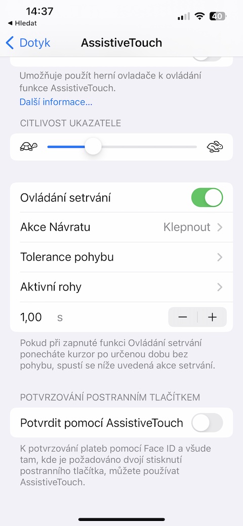 - V menu pod posuvníkem pro nastavení citlivosti ukazatele nejprve aktivujte položku Ovládání setrvání.