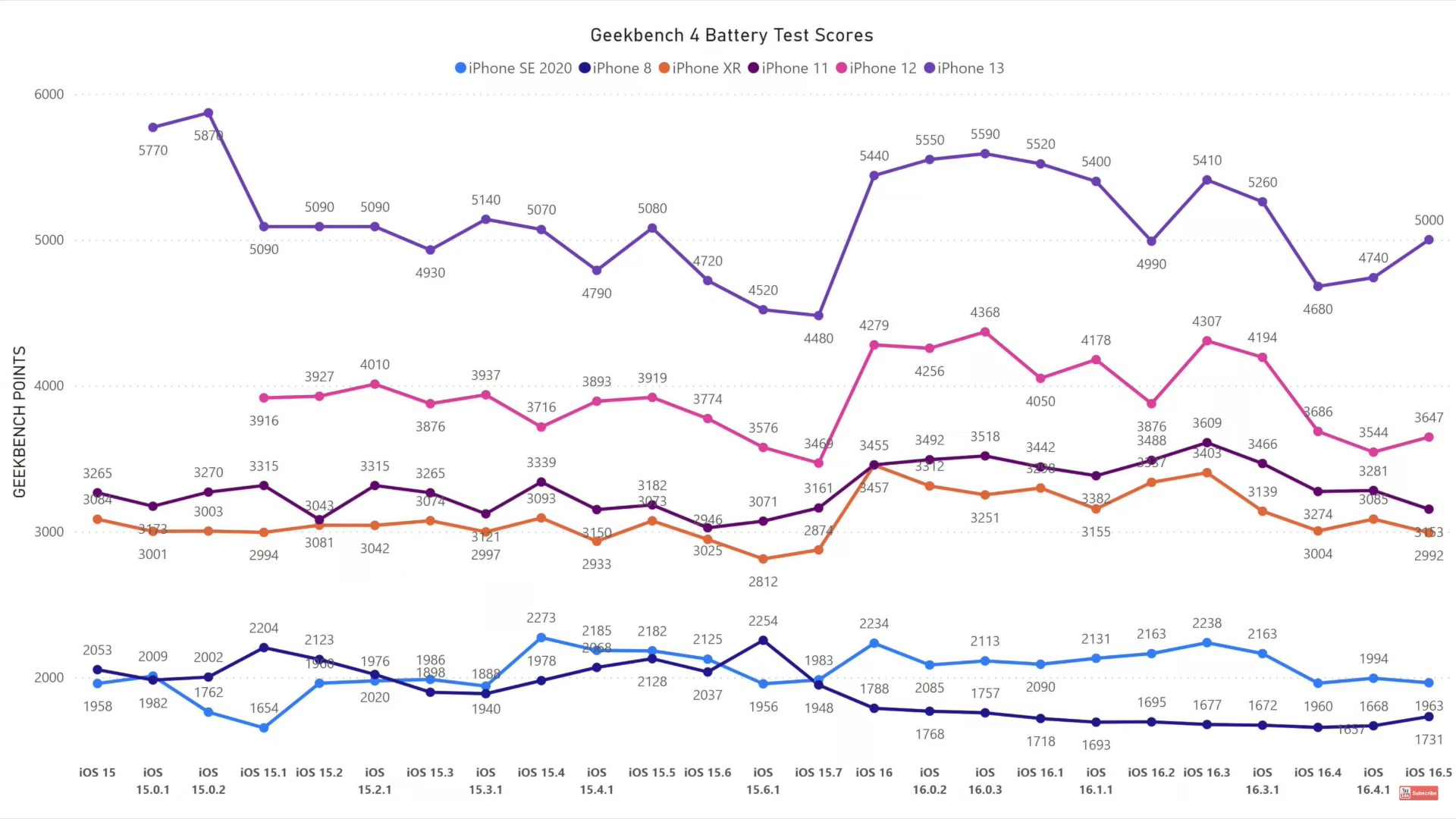 Hned úvodem se hodí říct, že oproti posledním aktualizacím je u některých modelů vidět i značné zlepšení. U iPhonu SE 2020 lze sledovat zanedbatelné zhoršení, neboť z 1994 bodů se propadl na 1963. U iPhonu 8 je situace zcela opačná a tento model si polepšuje z 1668 bodů na 1731. Smutní mohou být vlastníci iPhonu XR, neboť dosáhl na 2992 bodů, což je na iOS 16 doposud nejhorší výsledek. Pokles lze vidět také u „jedenáctky“, a to z 3281 bodů na 3153. Dále ale následuje pouze zlepšení. IPhone 12 se vytáhl z 3544 bodů na 3647. IPhone 13 pak z 4740 bodů na rovných 5000. Pozorujete po nainstalování aktualizace nějaké změny?