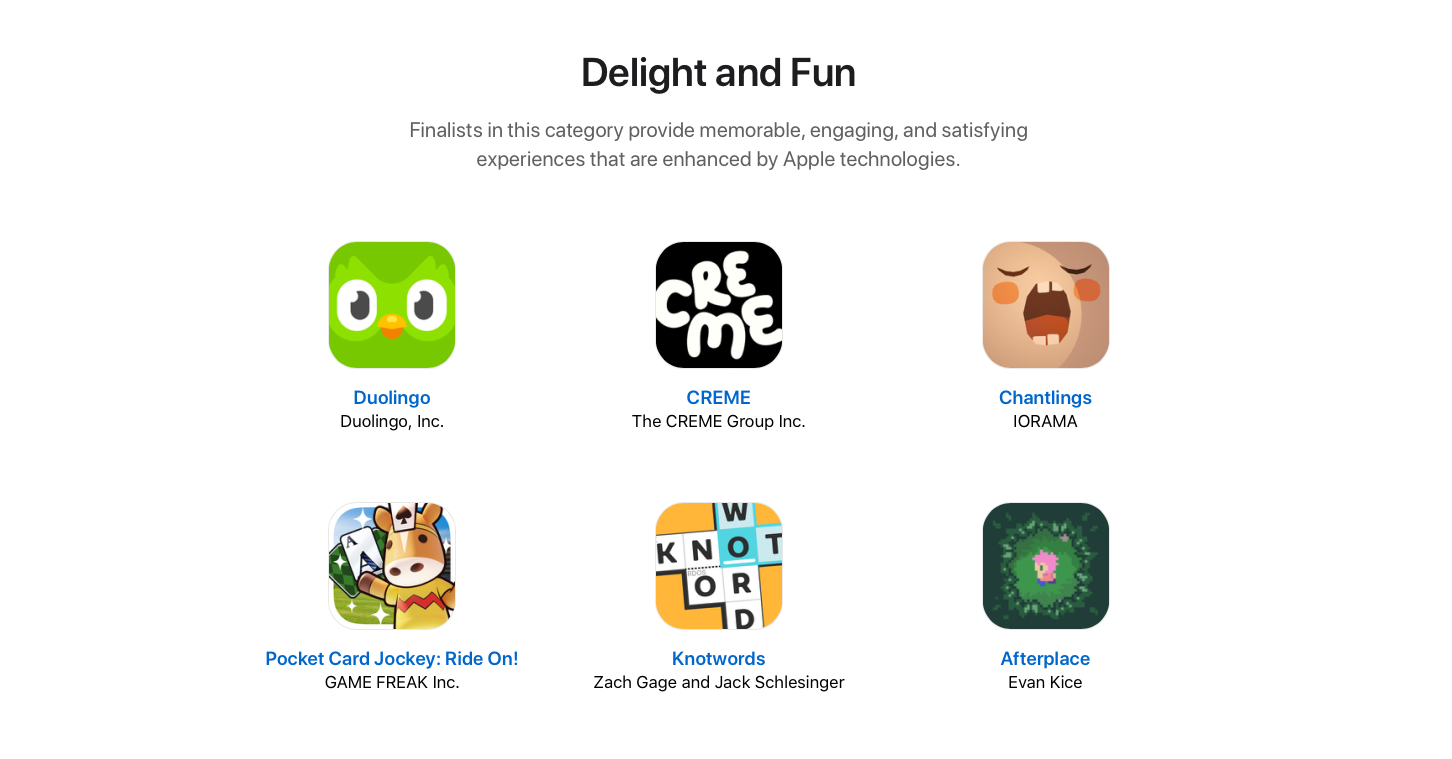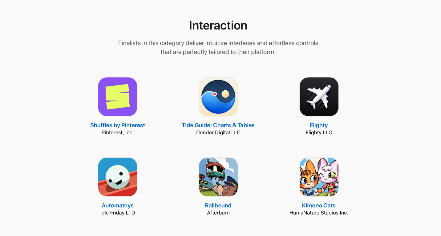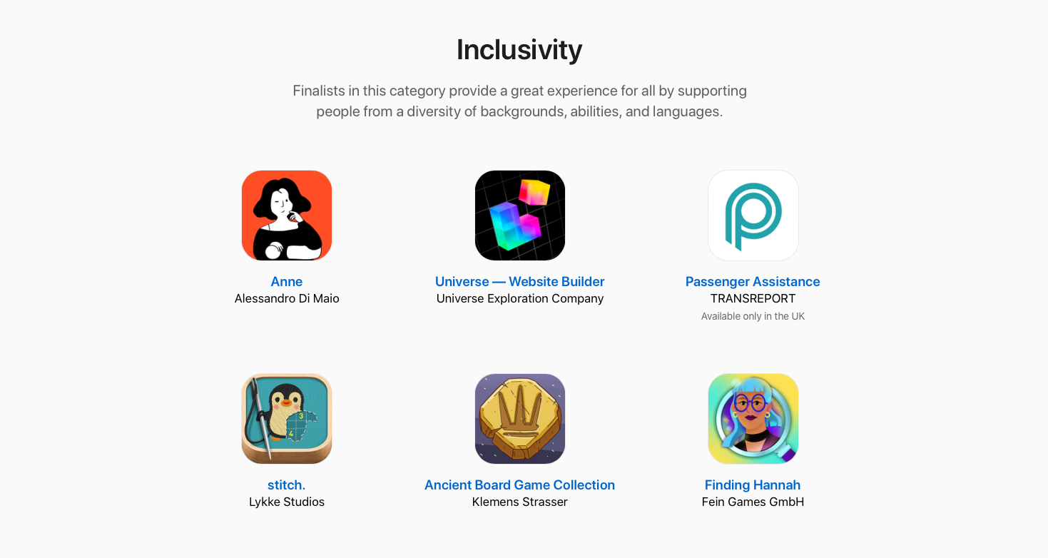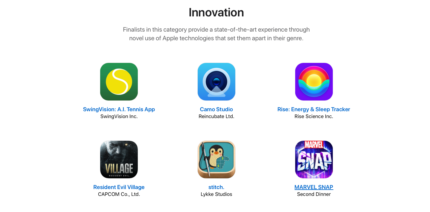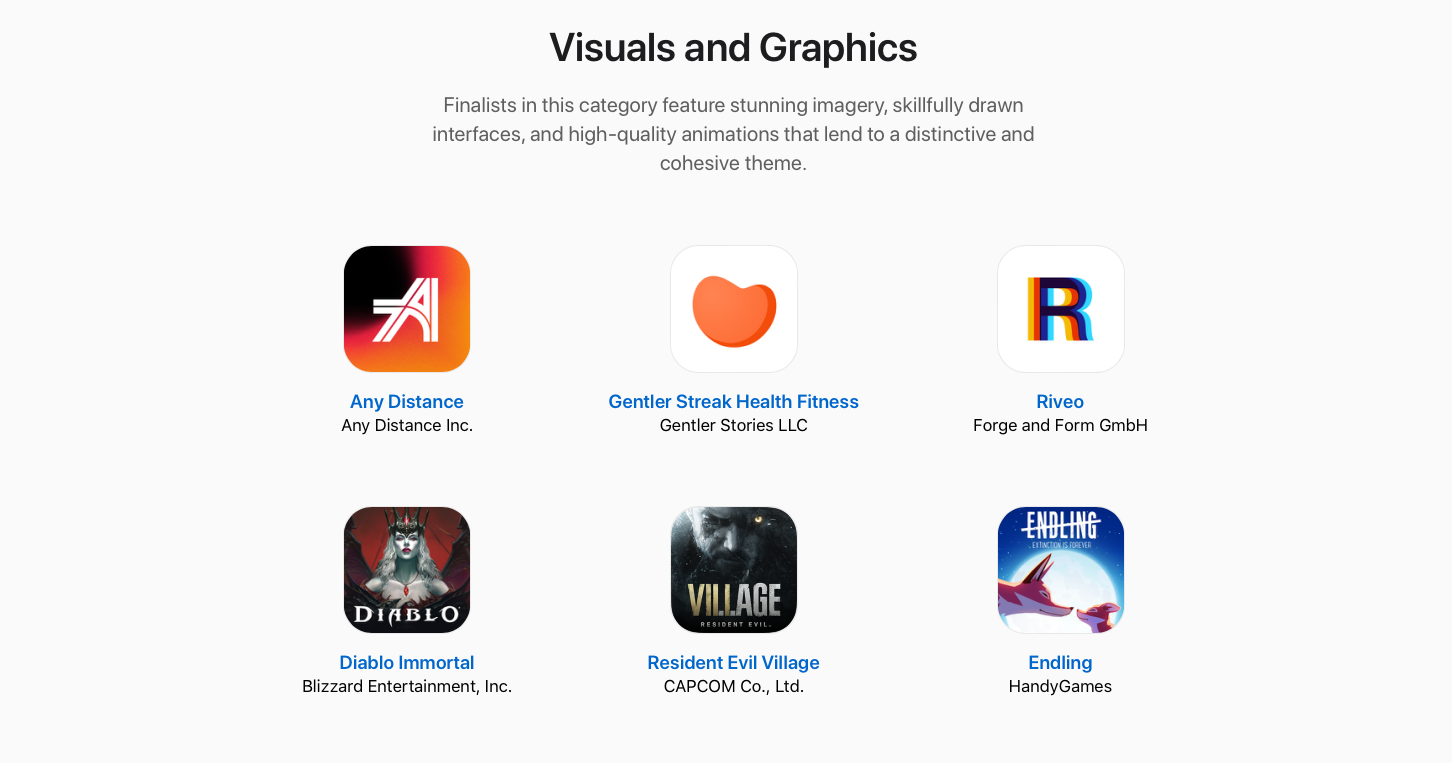 Ocenění je udělováno v kategoriích: Inkluzivita, Zábava a potěšení, Interakce, Sociální dopad, Vizuální a grafické zpracování a Inovace. Mezi nominovanými je například hned ve dvou kategoriích zmíněna jazyková aplikace Duolingo stejnojmenné vývojářské společnosti a dvou nominací se dočkalo i Resident Evil Village od CAPCOMu. Suverénně nejzajímavější pro české jablíčkáře je nicméně hra Beecarbonize z dílny českého studia Charles Games. Za zmínku jistě stojí třeba také velmi zajímavé Camo Studio společnosti Reincubate, jež získalo nominaci v kategorii Inovace nebo aplikace pro iPhone a Apple Watch s názvem Gentler Streak Health Fitnes od vývojářů Gentler Stories LLC zaměřená, jak už název napovídá, na sledování zdraví a kondice s důrazem na správnou rovnováhu mezi cvičením a odpočinkem, jež byla nominována v kategorii Vizuální a grafické zpracování. Kompletní seznam finalistů je dispozici na webových stránkách společnosti Apple.