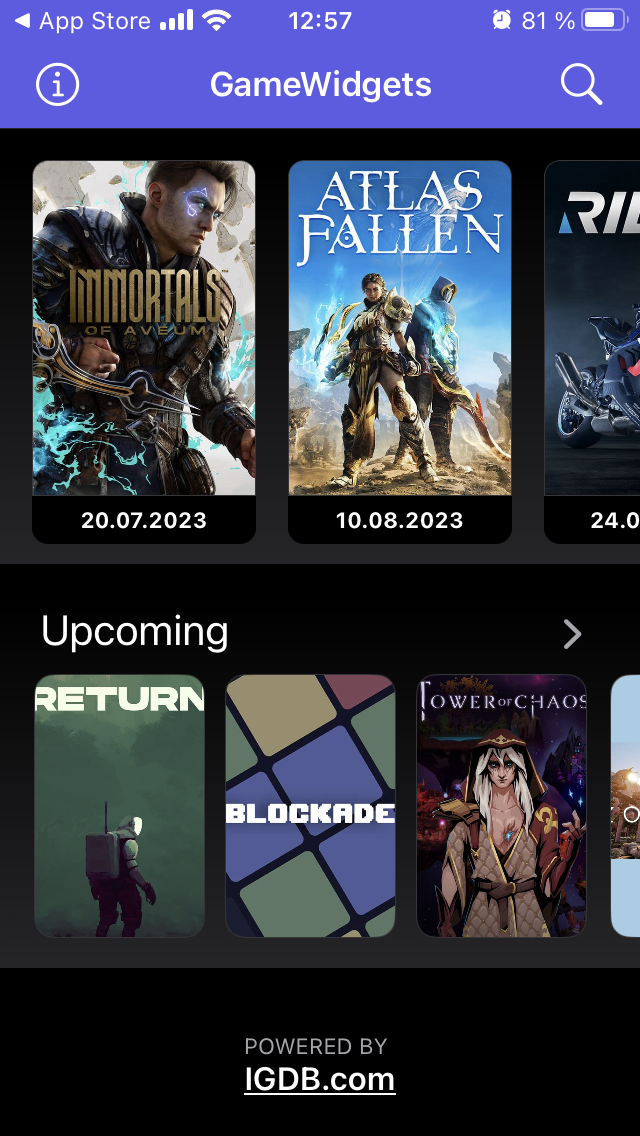 Game Widgets má přehledné a jednoduché uživatelské rozhraní němž v horní části nechybí seznam velkých titulů, jež se brzy objeví, následovaný vašimi oblíbenými a připravovanými hrami níže. K průzkumu slouží zabudovaný vyhledávací nástroj s podrobnostmi o hrách včetně snímků obrazovky a upoutávek. Dále zde máme tři různé typy zmíněných widgetů pro elegantní odpočítávání na domovské obrazovce vašeho iPhonu.