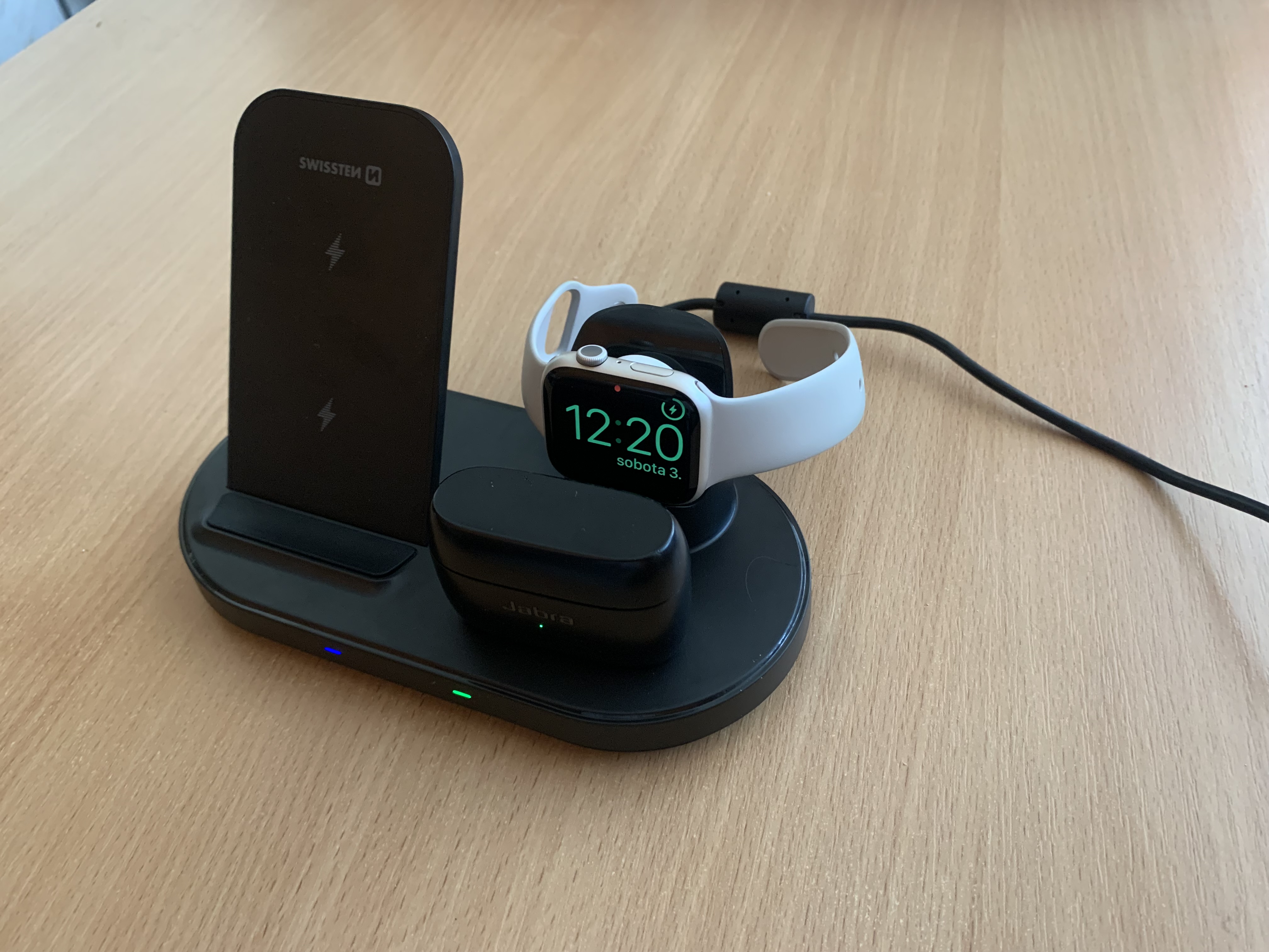 Hned úvodem se hodí říct, že pokud jste do dnešního dne nabíjeli klasickou „kabelovou“ cestou, jde o značné zjednodušení. Vidíte zde pouze jeden kabel, a to ten, který vede do nabíjecího stojánku. Hodí se pak jej umístit někam na okraj nočního stolku. Pak kabel neuvidíte vůbec. Rovněž je na místě dodat, že, i vzhledem k technickým specifikacím, se nejedná o žádný produkt, který vám vaše příslušenství či smartphone nabije rychlostí blesku. iPhone si standardem Qi vezme pouze 7,5 W (MagSafe zde není). Při jednoduchém výpočtu pak zjistíte, že jakmile nabíjíte trojici zařízení, dostane smartphone, stejně jako ostatní, pouze 5 W, což je v případě iPhonu „zábava“ na několik hodin. Jde tedy o ideální a pohodlný produkt pro situace, kdy na nabíjení nespěcháte. Samozřejmě počítejte s tím, že pro plné využití je třeba mít také výkonnou nabíječku, a to minimálně s 15 W. Pro tyto účely není nic jednoduššího, než objednat pořádně výkonný adaptér přímo od Swisstenu. Díky minimalistickému designu a černé variantě, kterou jsem recenzoval, si troufnu říct, že se produkt hodí kamkoli. Ani zde se nevyhnu drobné výtce nutnosti vlastnit, a hlavně zapojovat nabíjecí kabel pro Apple Watch. Ono zmíněné bludiště je fajn. Nicméně namotat se mi povedl kabel až na několikátý pokus. A když jsem si myslel, že mám vyhráno, zjistil jsem, že je převrácený. Tedy jsem musel vše opět odmotat, vypojit a narovnat. Jde vskutku o činnost, na kterou musíte mít pevné nervy. Ale jak říkám, jakmile tak učiníte jednou, máte pokoj. Nabíjecí kolečko pro Apple Watch ve zdířce drží opravdu dobře a nikdy se mi nestalo, že by se hodinky nezačaly kvůli špatné poloze nabíjet.