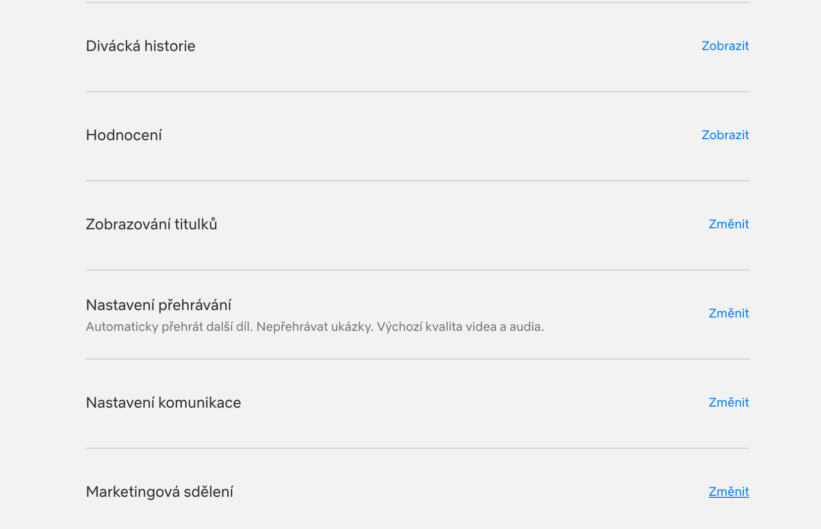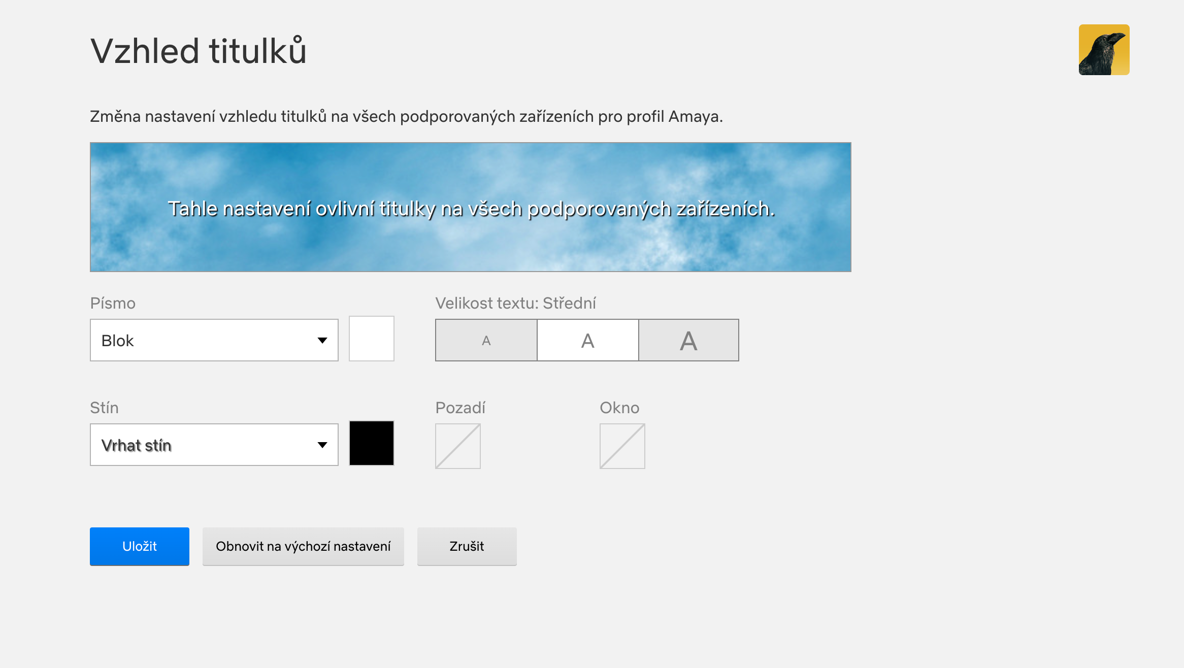 Webová verze Netflixu umožňuje uživatelům přizpůsobit zobrazení titulků. Pokud si chcete upravit titulky, přihlaste se na webu k vašemu netflixovému účtu a v pravém horním rohu klikněte na ikonku vašeho profilu. Zvolte Účet -> Profil a rodičovský zámek, rozklikněte panel s vaším profilem a následně v sekci Zobrazování titulků klikněte na Změnit.