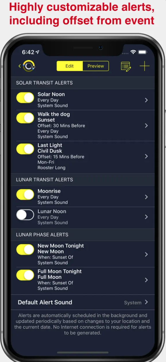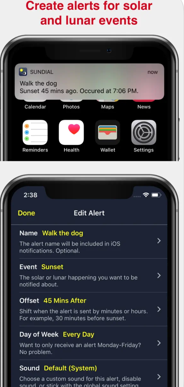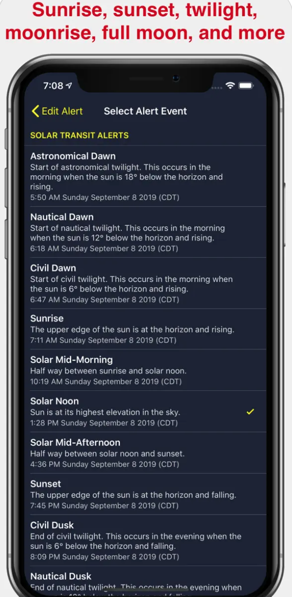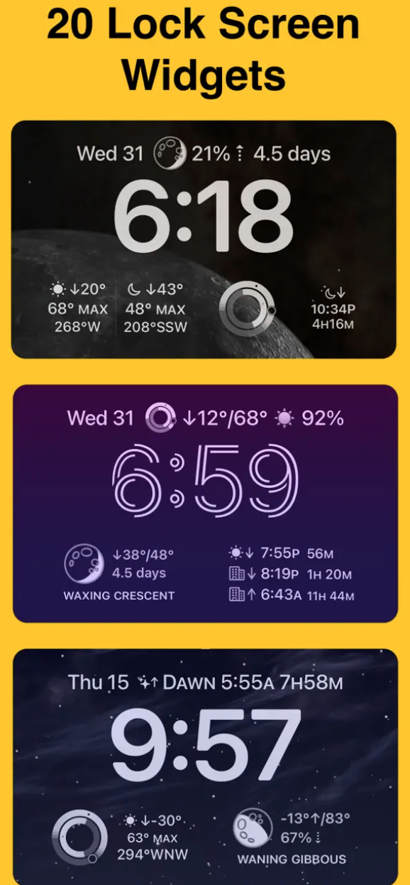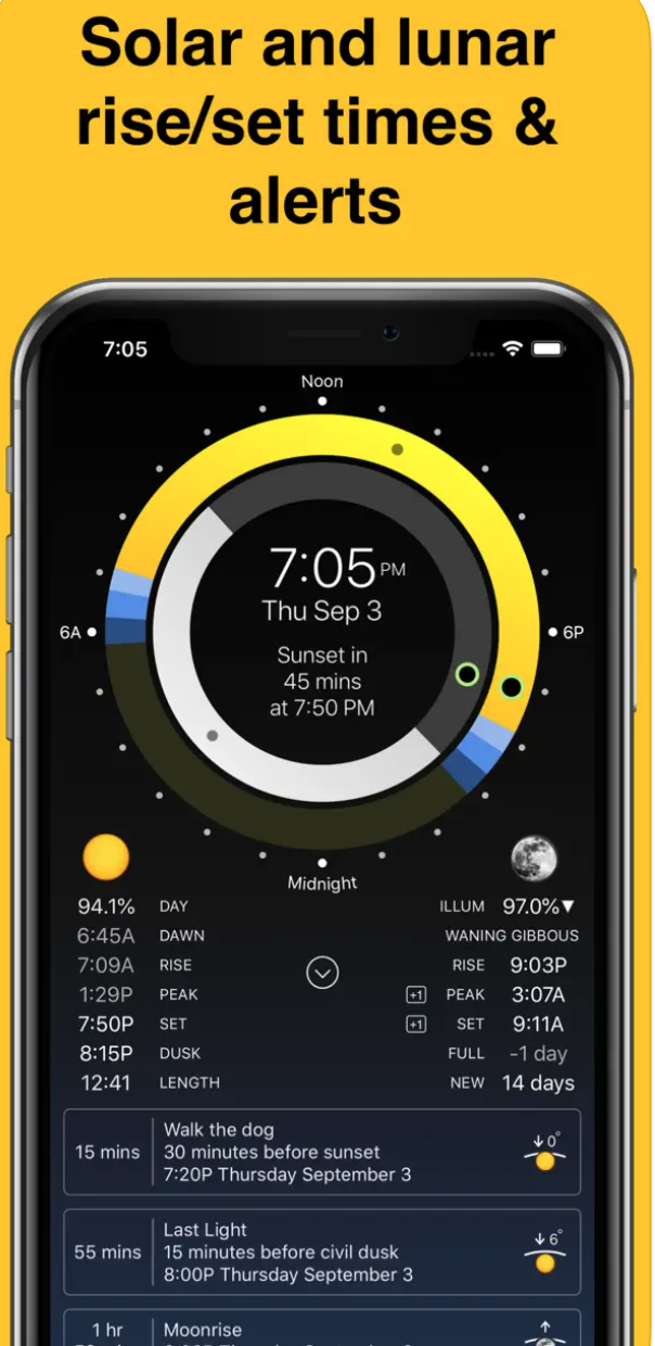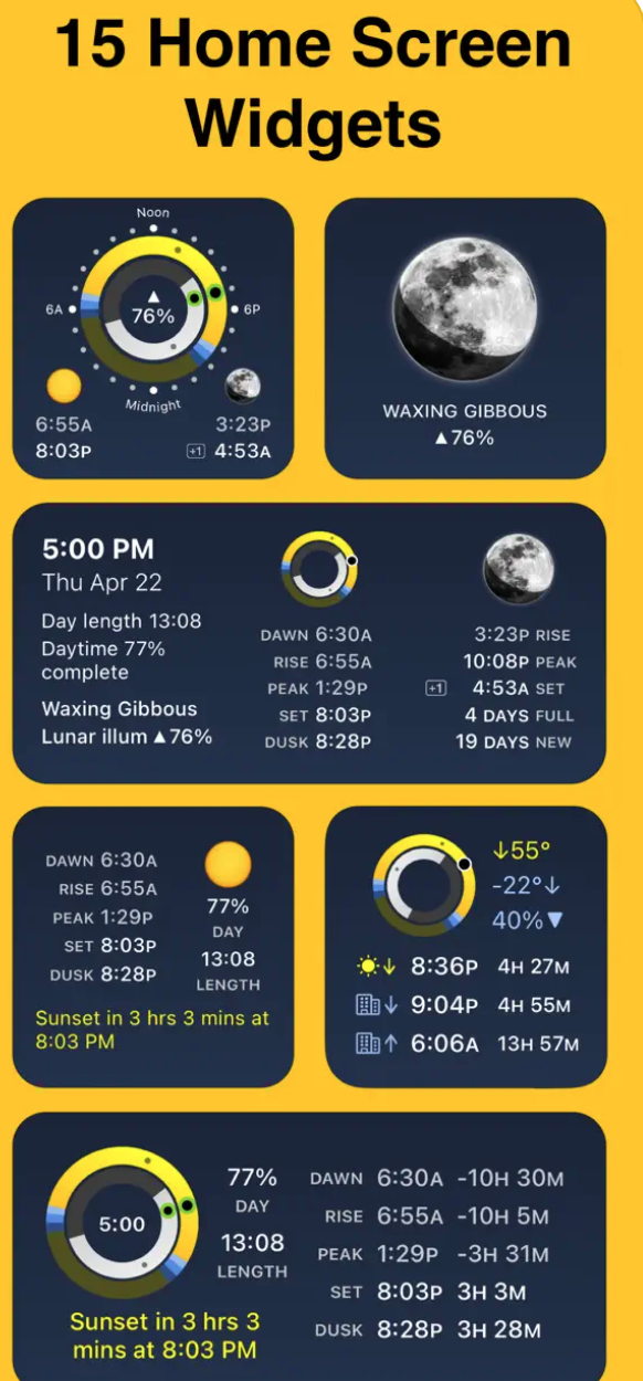 Aplikace Sundial Solar & Lunar Time vám poskytne celou řadu widgetů jak pro plochu, tak i pro zamčenou obrazovku vašeho iPhonu. Existuje také ve verzi pro Apple Watch. Ve formě widgetů vám Sundial Solar & Lunar Time poskytne řadu informací o východu a západu slunce, jednotlivých částech dne nebo třeba o fázích Měsíce.
