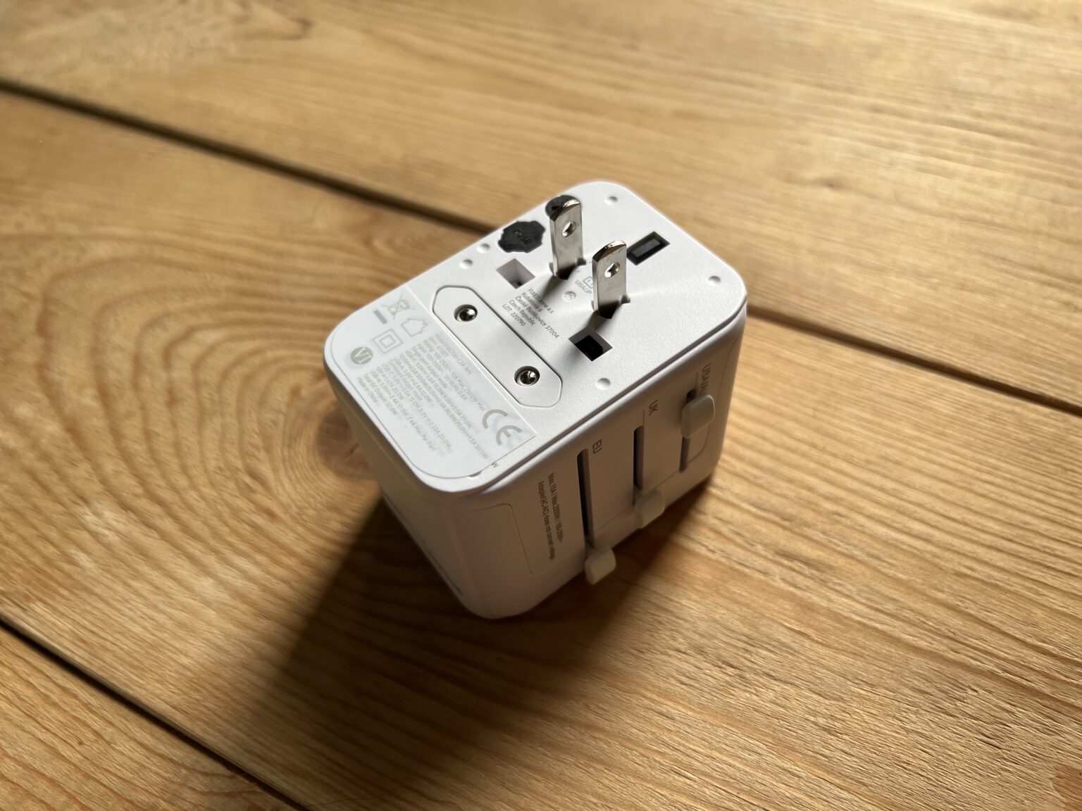 Na levé straně adaptéru jsou tři jezdci, které z něho vysouvají patřičné vidlice pro požadované použití. Stačí jej zmáčknout a vysunout, na konci drážky zapadne, takže se vám nestane, že při zasouvání adaptéru do zásuvky vám vidlice zajede zpět. Je zde EU standard (Typ C), Britský standard (typ G), USA/Japonský standard (typ A), Australský/Čínský standard (typ I) a typy B, E, F, J, L, N. V případě řešení USA/AUS je jen nutné vidlici pootočit podle standardu, který potřebujete. USA a Japonsko má vidlici svislou, Austrálie ale pod úhlem. Na zadní straně adaptéru je to samozřejmě vyobrazeno.