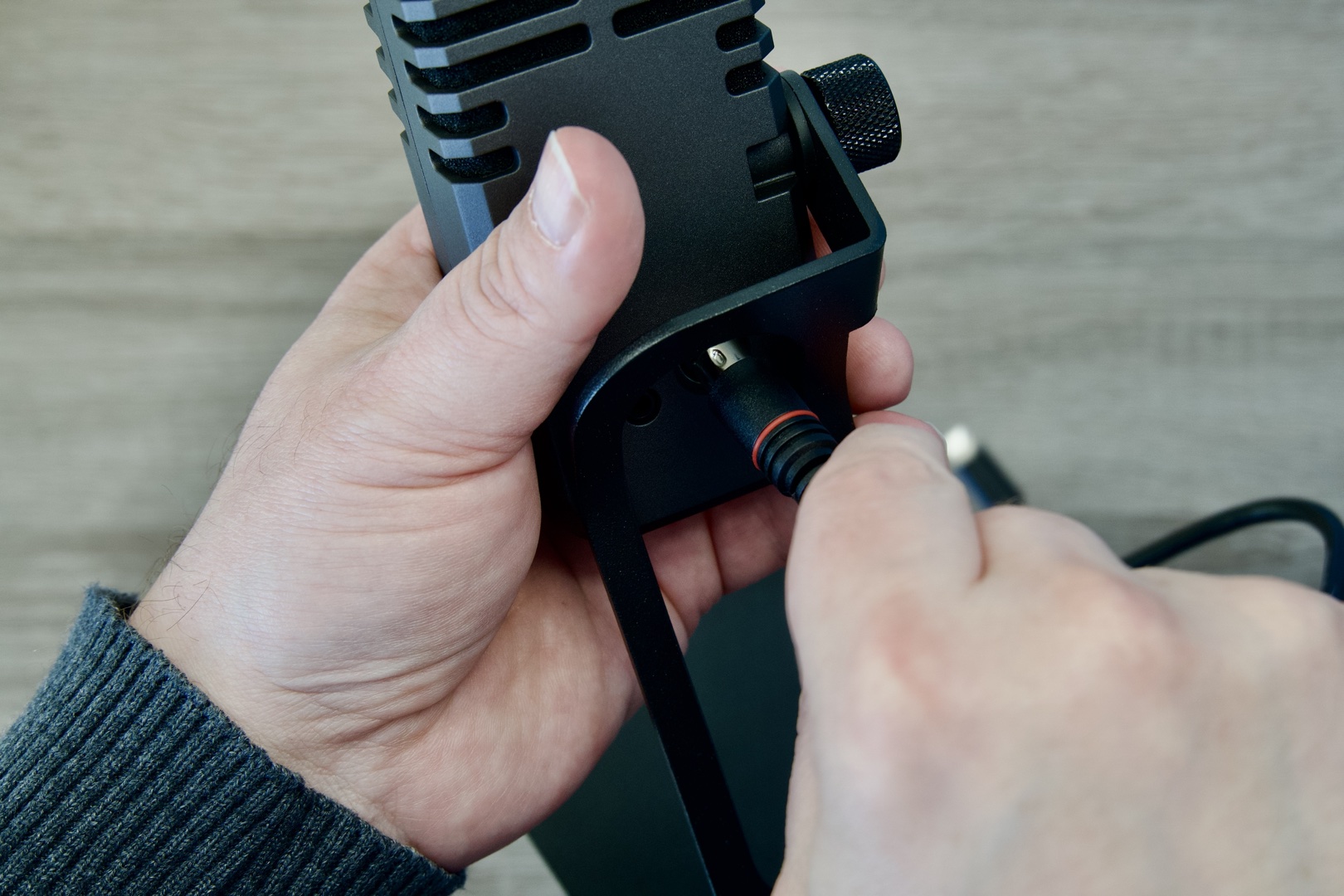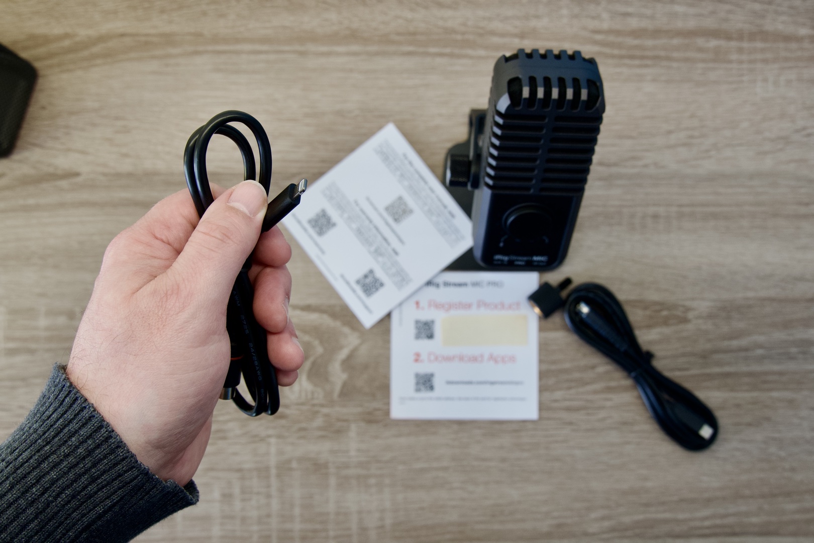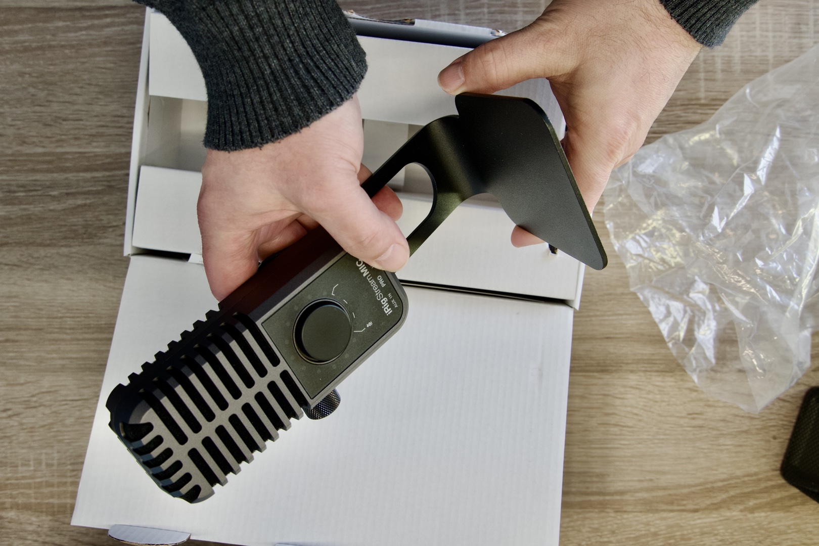 Po vysunutí pro IK Multimedia klasické červené krabice se před vámi objeví obyčejný bílý box bez potisku. Po jeho otevření již narazíte na samotný mikrofon s robustním kovovým stojánkem, přičemž ve výplni krabice se ukrývají 2 kabely – mini-DIN na lightning o délce 60 cm, který využijete s Apple zařízeními jako iPhone, iPad nebo iPod, metr a půl dlouhý mini-DIN na USB-C pro připojení k zařízení se systémem Android, macOS nebo Windows a ještě praktická redukce na klasický mikrofonní stojan 5/8″ na 1/4, pakliže budete chtít mikrofon umístit na vlastní stojan nebo rameno. Výčet uzavírají 2 kartičky, jedna s registračním číslem produktu a odkazem ke stažení doporučeného softwaru a druhá nabízející možnost stažení manuálu, záručních podmínek a nabídkou podpory, vše opatřeno QR kódy, takže informace dohledáte opravdu rychle.