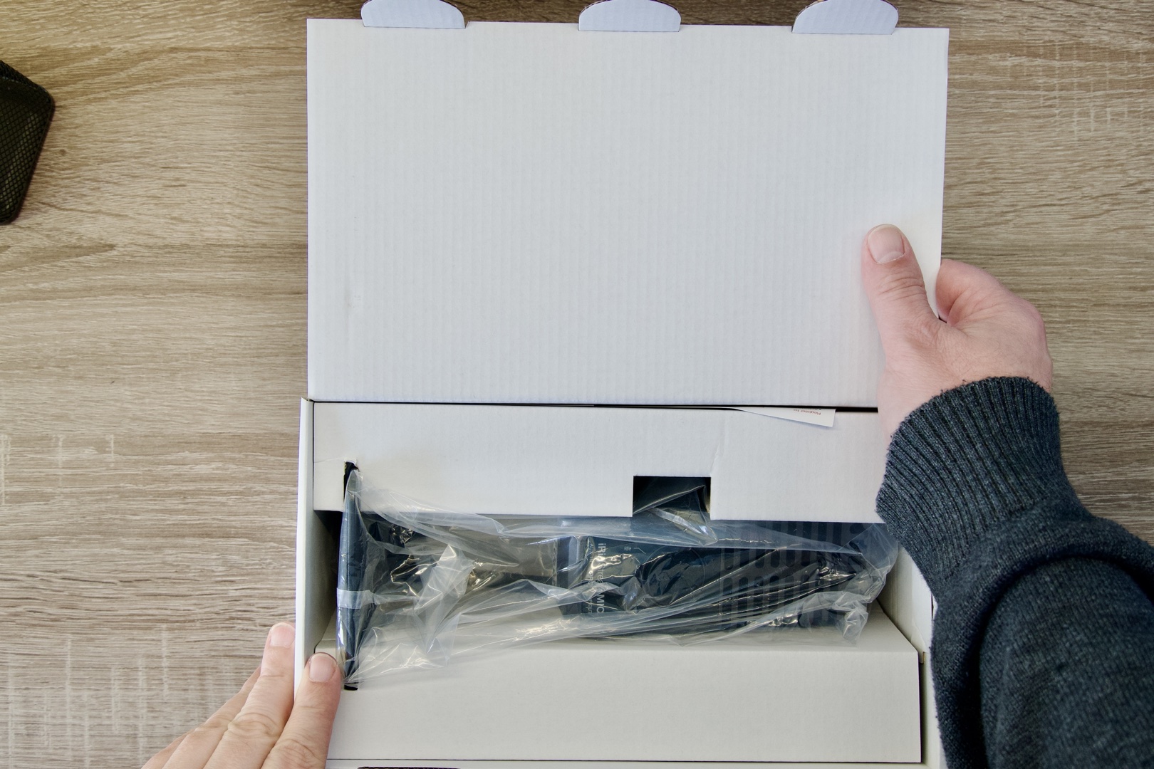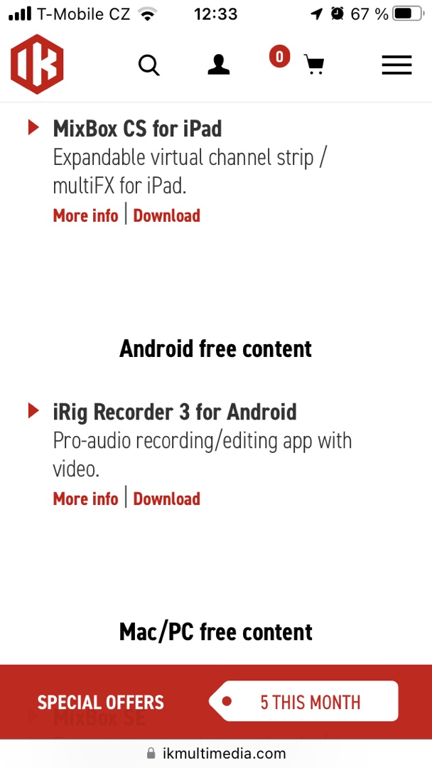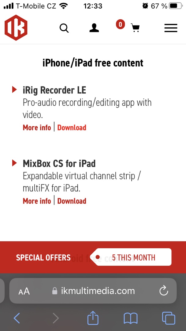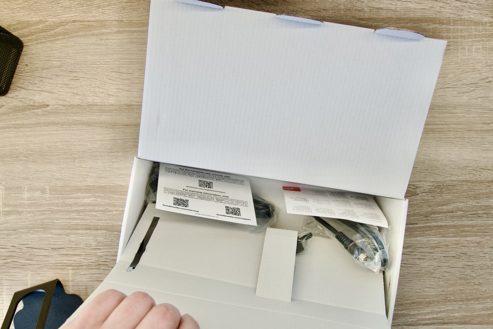 Po vysunutí pro IK Multimedia klasické červené krabice se před vámi objeví obyčejný bílý box bez potisku. Po jeho otevření již narazíte na samotný mikrofon s robustním kovovým stojánkem, přičemž ve výplni krabice se ukrývají 2 kabely – mini-DIN na lightning o délce 60 cm, který využijete s Apple zařízeními jako iPhone, iPad nebo iPod, metr a půl dlouhý mini-DIN na USB-C pro připojení k zařízení se systémem Android, macOS nebo Windows a ještě praktická redukce na klasický mikrofonní stojan 5/8″ na 1/4, pakliže budete chtít mikrofon umístit na vlastní stojan nebo rameno. Výčet uzavírají 2 kartičky, jedna s registračním číslem produktu a odkazem ke stažení doporučeného softwaru a druhá nabízející možnost stažení manuálu, záručních podmínek a nabídkou podpory, vše opatřeno QR kódy, takže informace dohledáte opravdu rychle.