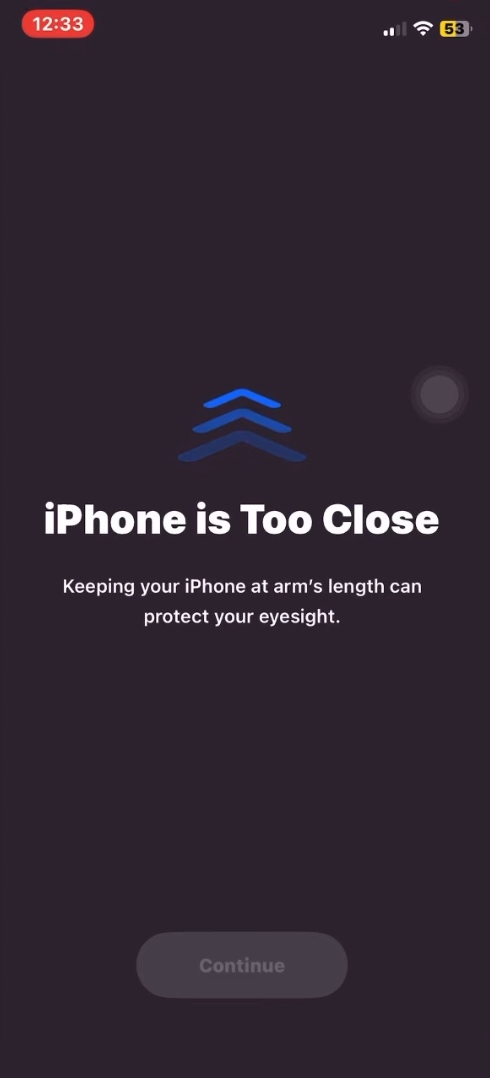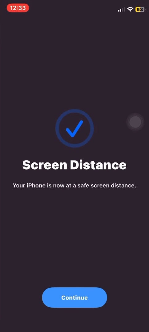 Je-li funkce zapnutá, obdrží sledující za zmíněných podmínek upozornění „iPhone je příliš blízko“. Po oddálení telefonu do bezpečné polohy se na obrazovce objeví „Screen Distance“ se symbolem potvrzujícím, že vzdálenost je nyní v pořádku a po klepnutí na tlačítko „Pokračovat“ lze zařízení nadále nerušeně používat.