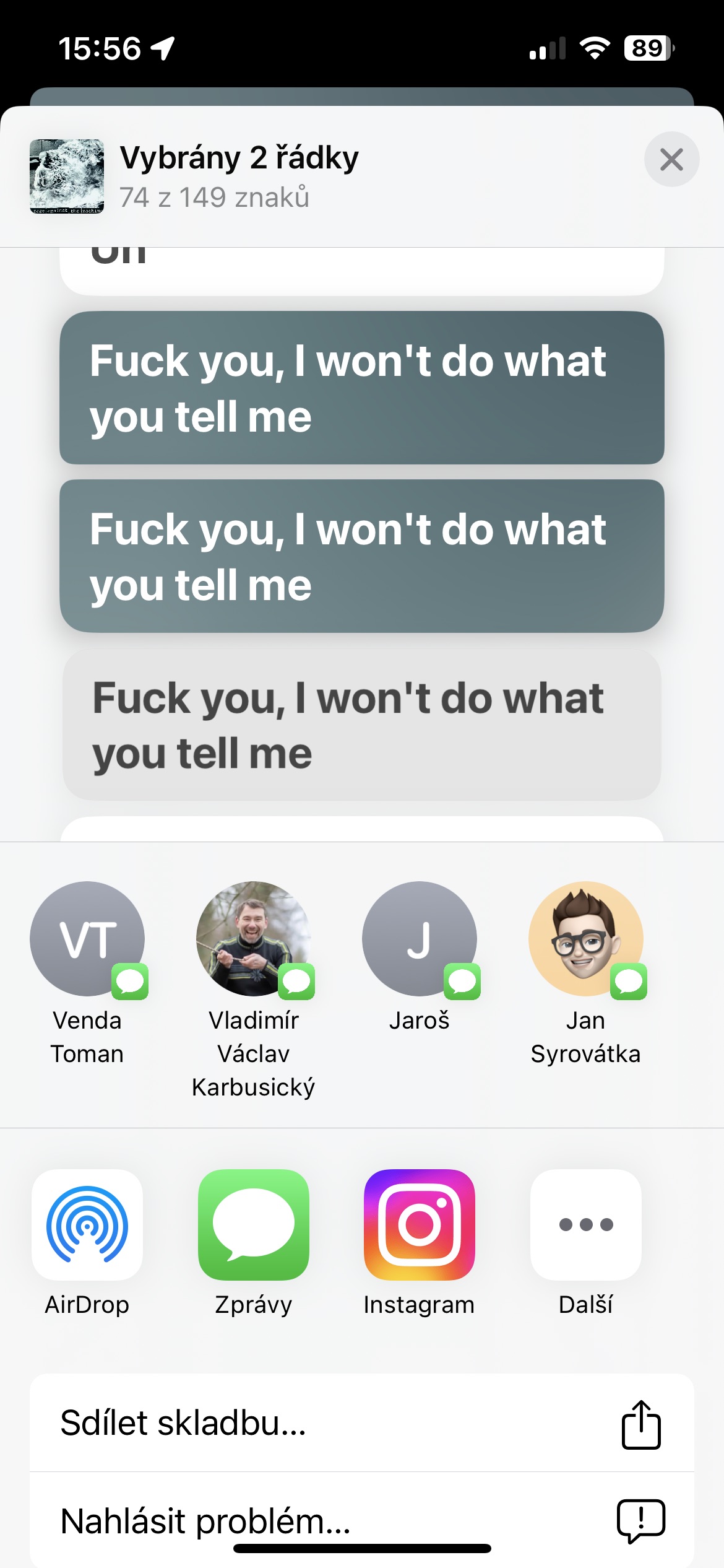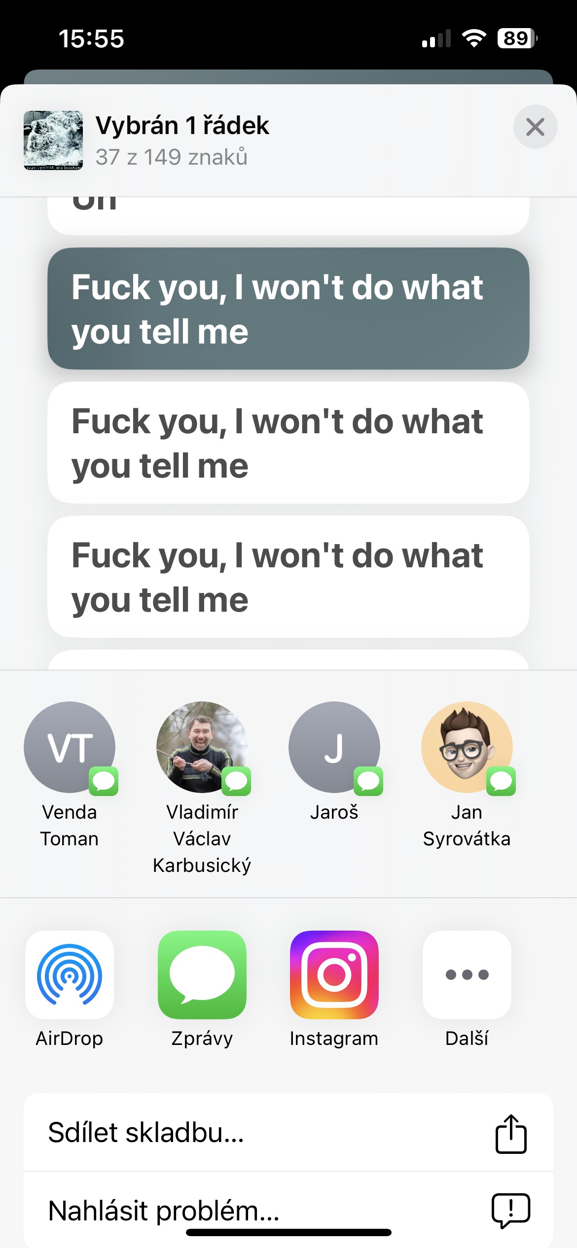 Zasáhl vás hluboce text některé skladby a chtěli byste jej sdílet s ostatními? Spusťte skladbu a dole vlevo klepněte na ikonku uvozovek. Dlouze stiskněte text, který chcete sdílet, vyberte případně více řádků a poté jen zvolte adresáta a vhodný způsob sdílení.