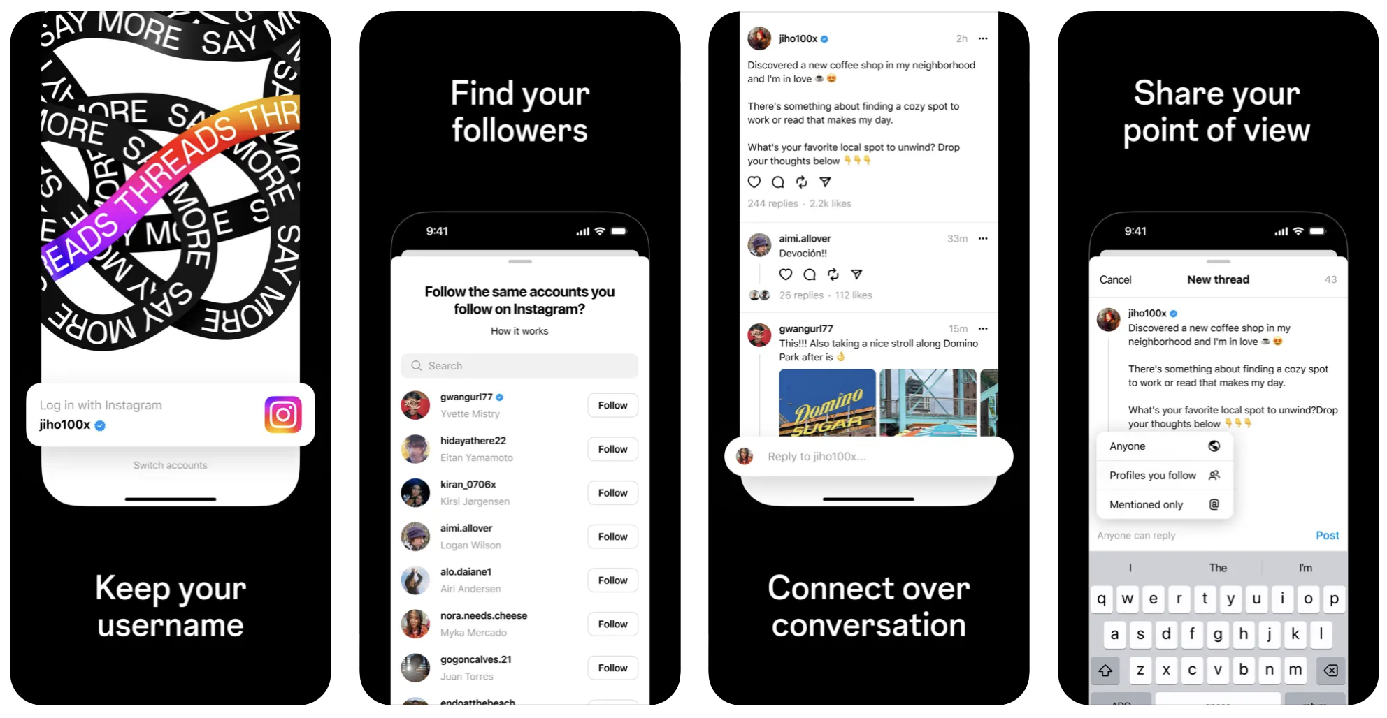 Do Threads se není nutné registrovat, stačí vám účet na Instagramu nebo Facebooku a můžete začít psát příspěvky o délce maximálně 500 znaků, což je výrazně víc než na Twitteru, který je omezen na 280 znaků a do nedávna dokonce jen na 140 znaků. Právě možnost použít Instagram, respektive Facebook pro přihlášení do sociální sítě Threads je její aktuálně nejsilnější stránkou. Abyste si ji mohli vyzkoušet, nemusíte se nikde registrovat a začít přispívat můžete okamžitě. Instagram má měsíčně přes 2 miliardy aktivních uživatelů, zatím co Twitter „pouze“ 364 milionů.