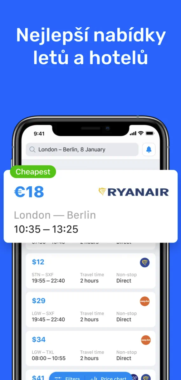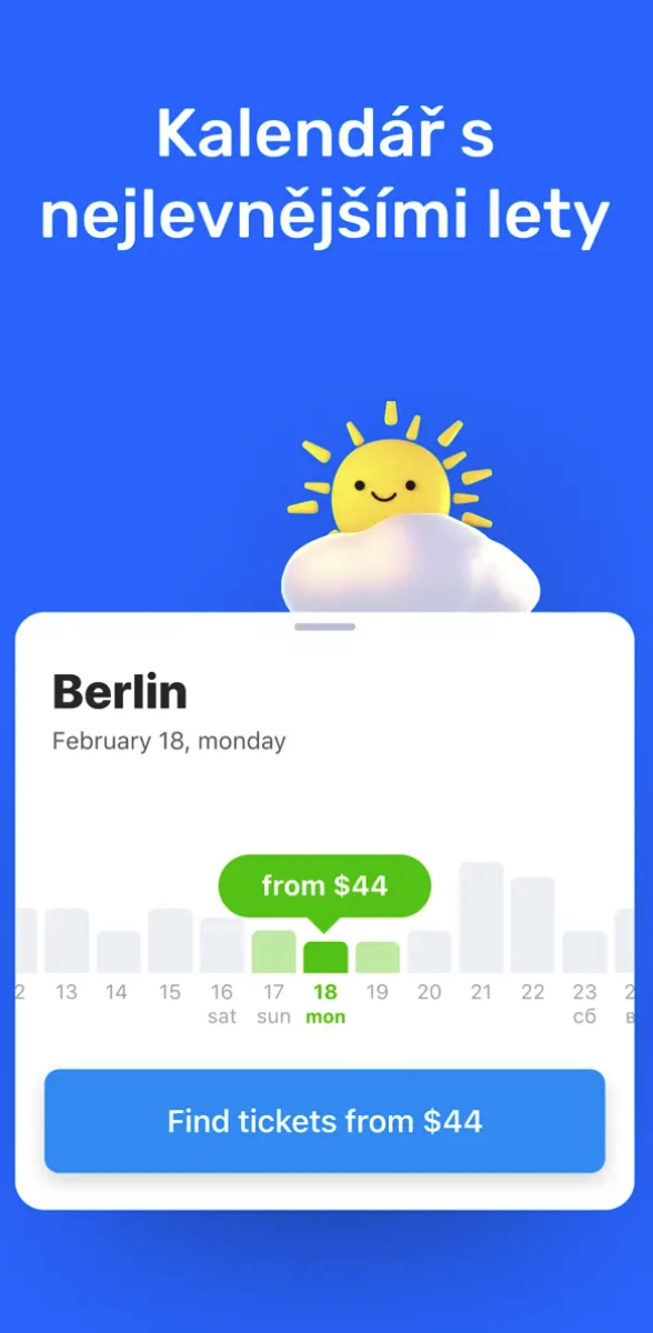 Pokud se na dovolenou budete vydávat letecky, pomůže vám aplikace Skyscanner. Jejím prostřednictvím můžete vyhledávat a platit lety, ale třeba také zabookovat romantický pobyt nebo si zarezervovat půjčení automobilu. V aplikaci Skyscanner budete mít vždy vše potřebné přehledně na jednom místě.