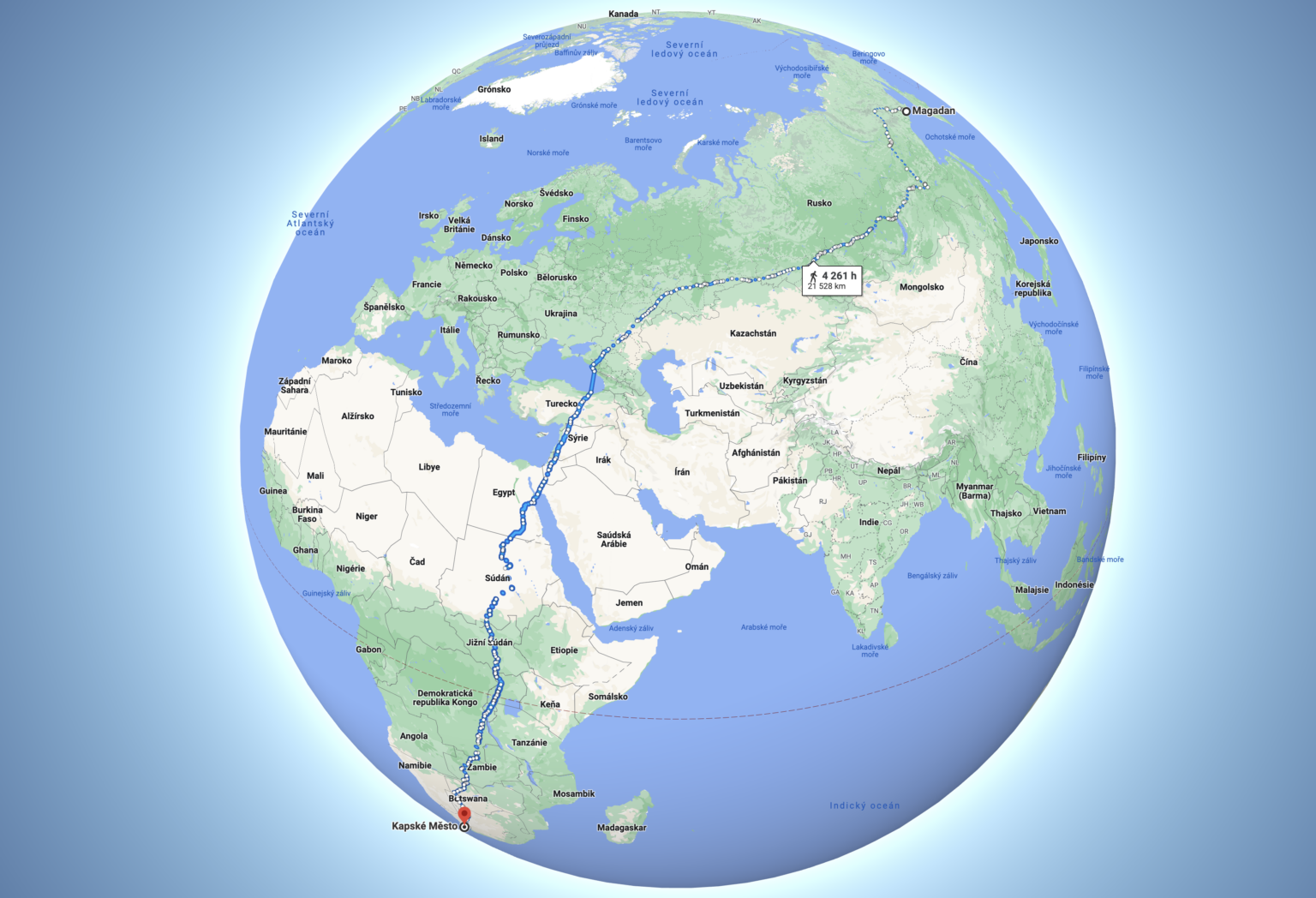 Podle Google Maps byste tuto vzdálenost urazili za 4261 hodin, tedy za 177 dní. To byste však patrně umřeli zhruba po 1 % z celkové trasy, protože Google Maps počítají ve svém časovém výpočtu s tím, že půjdete takříkajíc nonstop. Pokud bychom počítali s tím, že půjdete 8 hodin každý den, bez jediného dne odpočinku, pak byste při průměrném tempu ušli tuto trasu za 532 dní. Po cestě byste mimo jiné šli napříč celou Afrikou, poté kolem Suezského průplavu, přes Turecko, střední Asii, Sibiř až do Magadanu. Celkově byste prošli přes 16 různých zemí. Pokud se tedy v nejbližších dvou letech plánujete nudit a máte rádi chůzi, pak by mohl být tento trip něco pro vás.