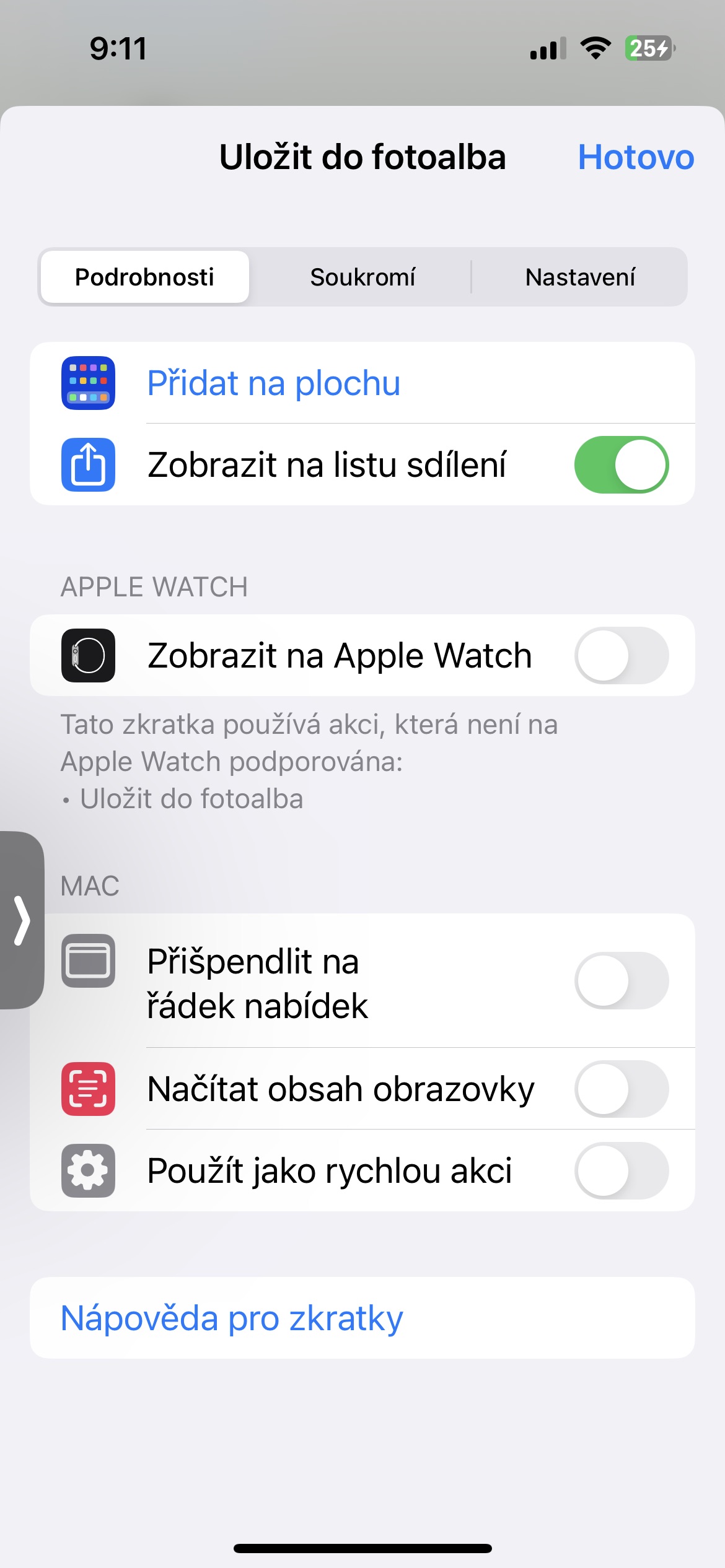 - Ve spodní části displeje klepněte na ⓘ a aktivujte položku Zobrazit na listu sdílení.