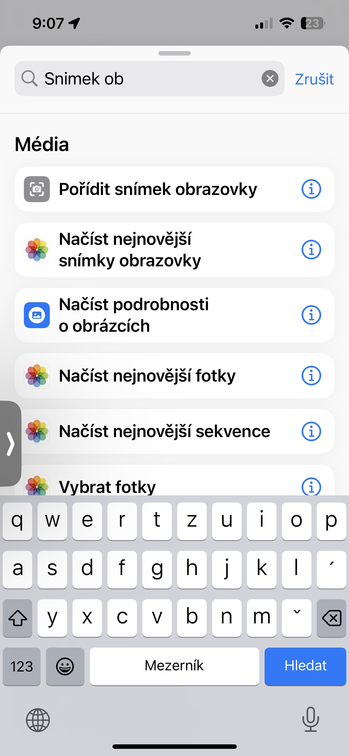 - Ze seznamu akcí přidejte akci Pořídit snímek obrazovky.