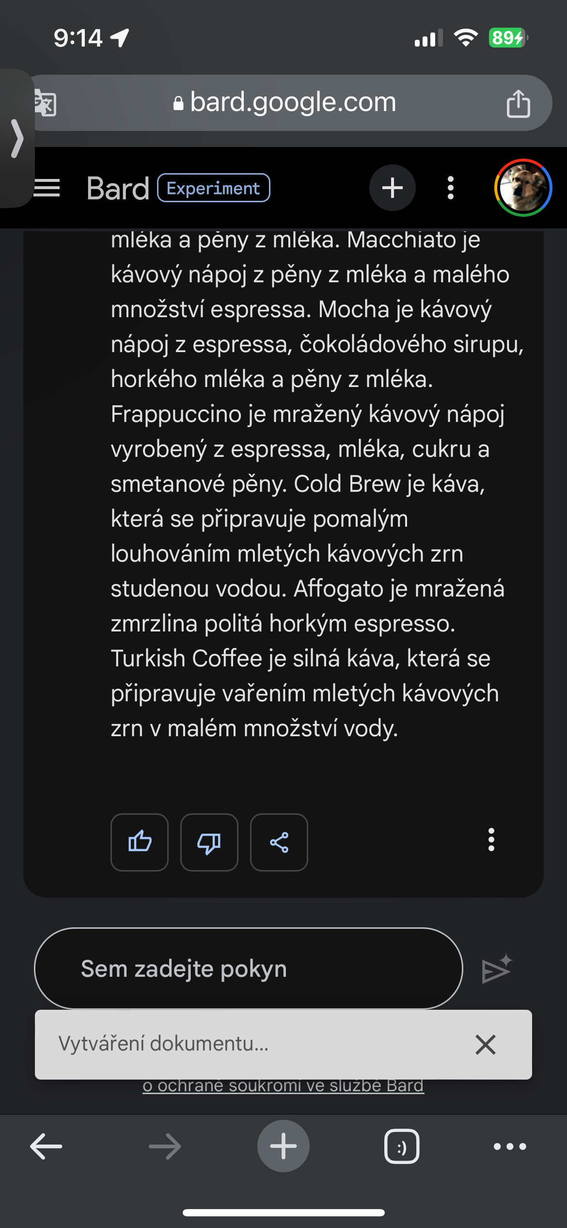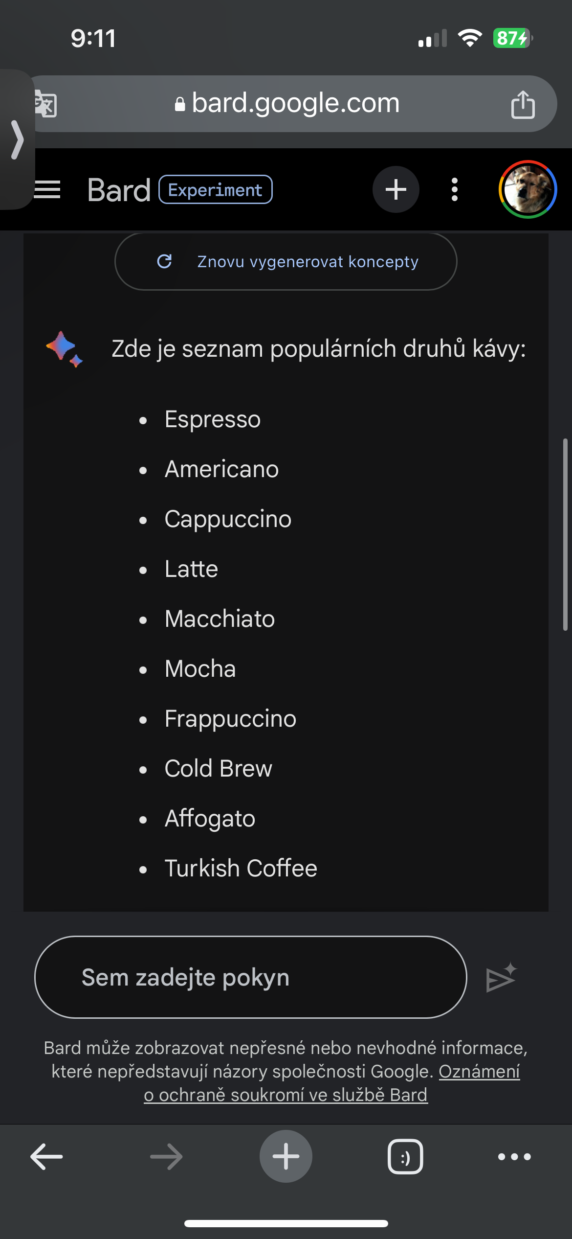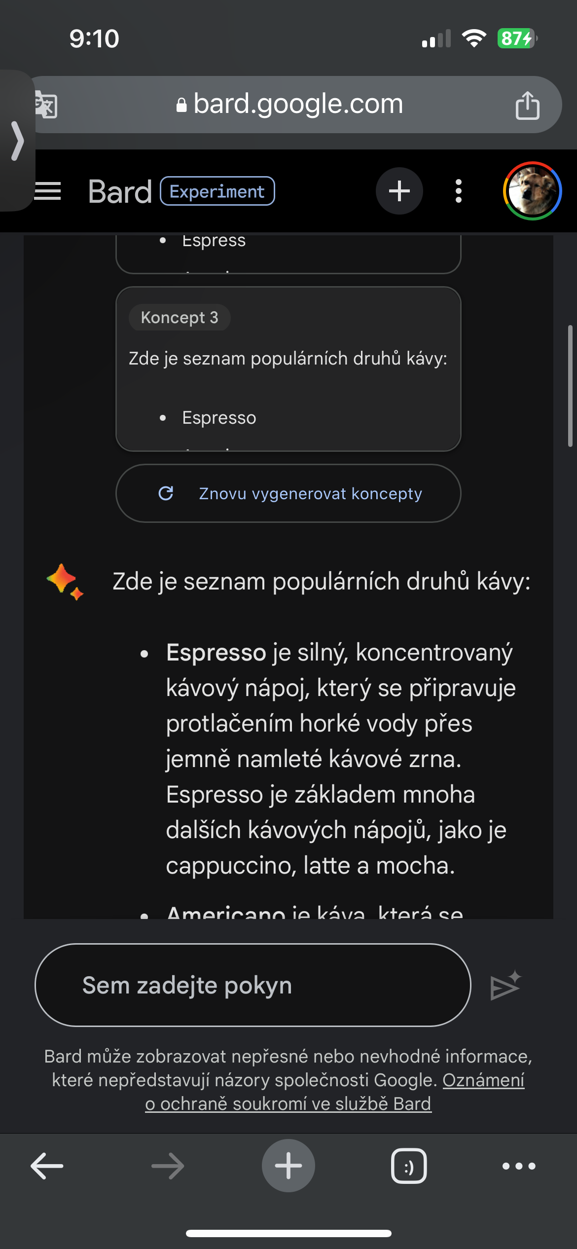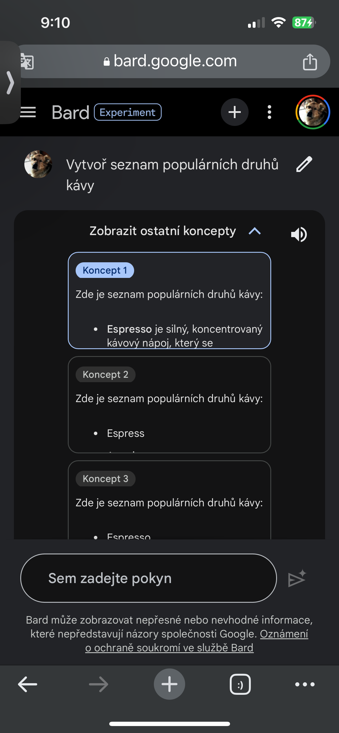 Nechali jste si od Barda vygenerovat odpověď na váš požadavek, ale nejste spokojeni s podobou výsledku? Těsně nad vygenerovanou odpovědí si můžete všimnout položky Zobrazit ostatní koncepty. Pro výběr alternativního konceptu klepněte na šipku napravo od tohoto nápisu a vyberte jinou odpověď. Pod nabídkou konceptů můžete rovněž klepnout na tlačítko Znovu vygenerovat koncepty.