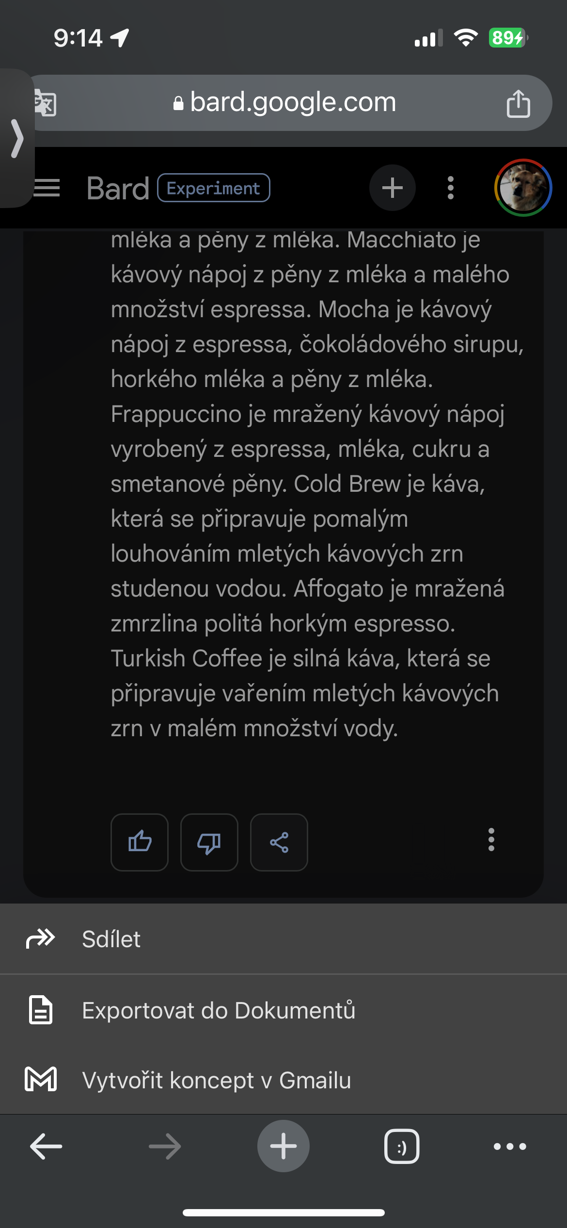 Odpověď, kterou vám Google Bard vygeneroval, můžete snadno, rychle a efektivně exportovat do Dokumentů Google, případně z ní vytvořit koncept v e-mailové službě Gmail. Zamiřte zcela dolů a pod vygenerovanou odpovědí klepněte na ikonku sdílení. Následně vyberte požadovaný způsob exportu.