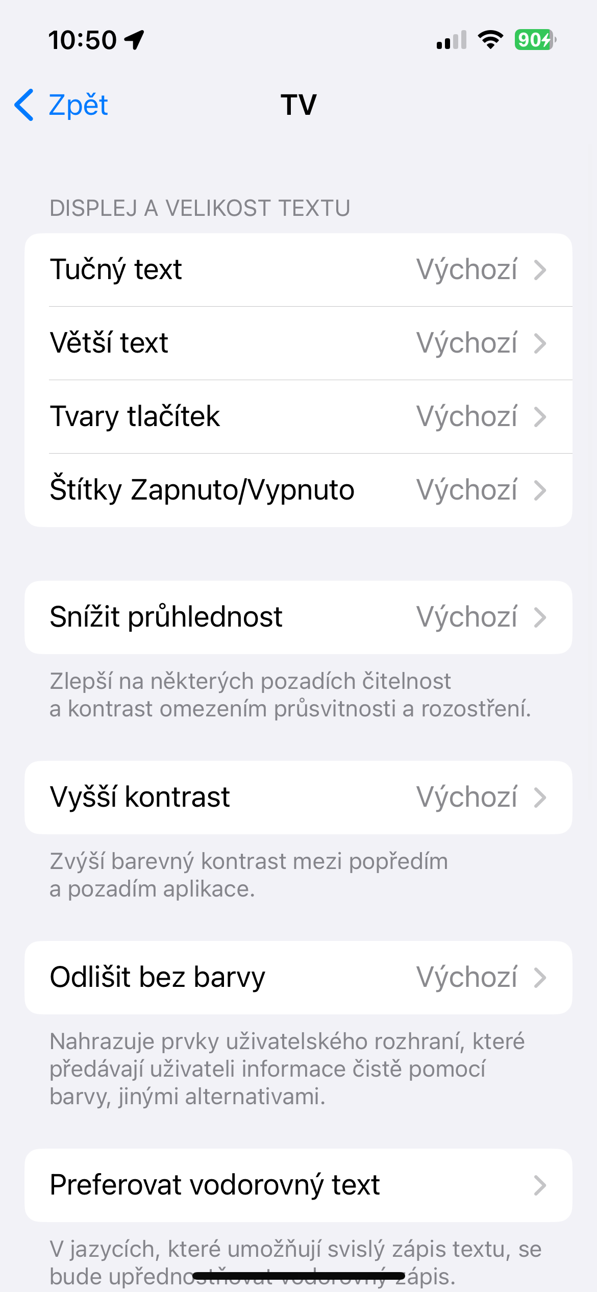 Výběrem tmavého nebo světlého vzhledu aplikace Apple TV možnosti přizpůsobení teprve začínají. Přejděte do Nastavení -> Zpřístupnění -> Nastavení na úrovni aplikací -> Přidat aplikaci. V seznamu vyberte aplikaci TV a přejděte do jejích předvoleb. Zde můžete nastavit tučný text, velikost textu, tvary tlačítek, kontrast, průhlednost, popisky, pohyb a další. A tato nastavení platí pouze pro aplikaci TV. V systému iOS 17 můžete také preferovat vodorovný text v jazycích, které podporují svislý text, a také ovládat animované obrázky.
