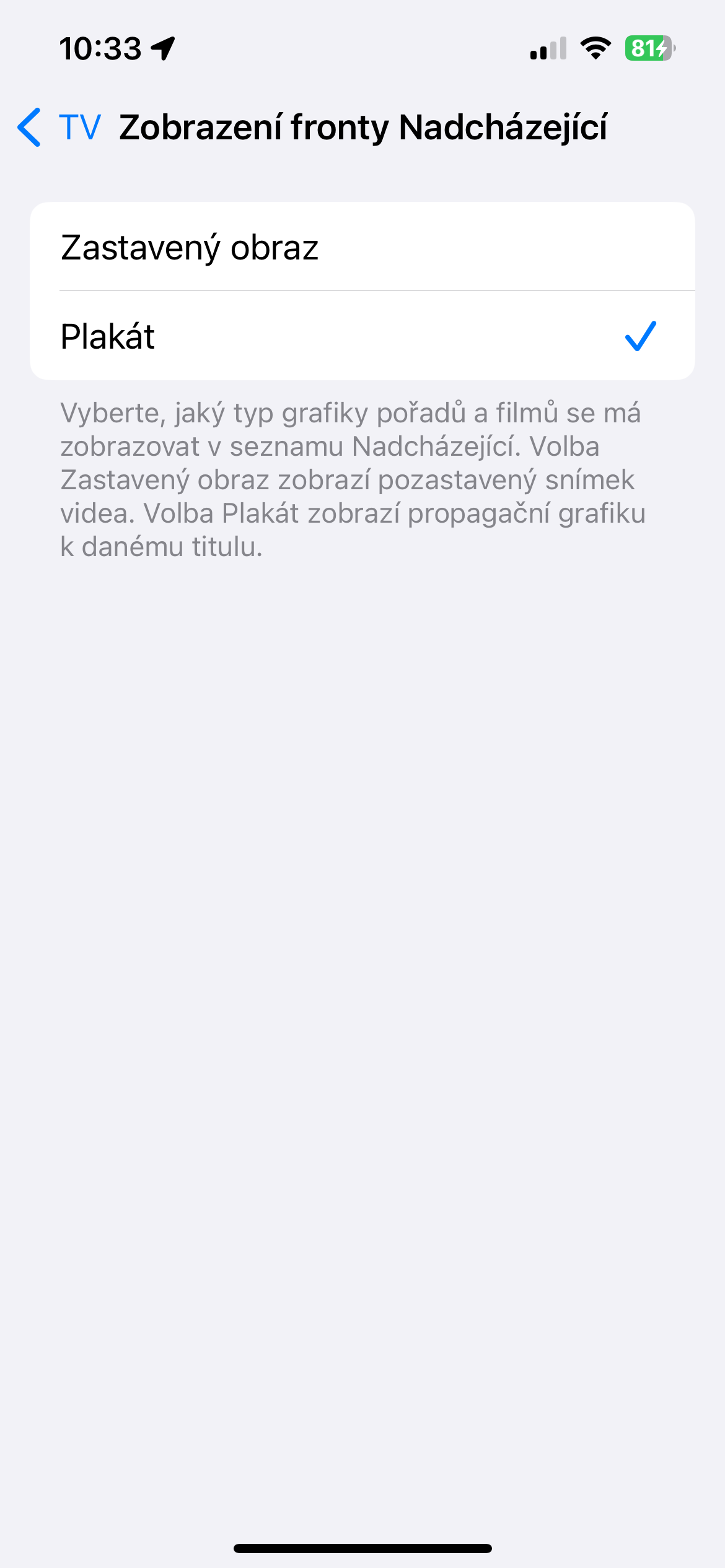 Pokud na iPhonech s operačním systémem iOS 15.4 a novějším spustíte Nastavení -> TV -> Zobrazení fronty Nadcházející, můžete zvolit, zda se ve frontě nadcházejícího obsahu bude zobrazovat statický obraz nebo výchozí plakát daného pořadu.