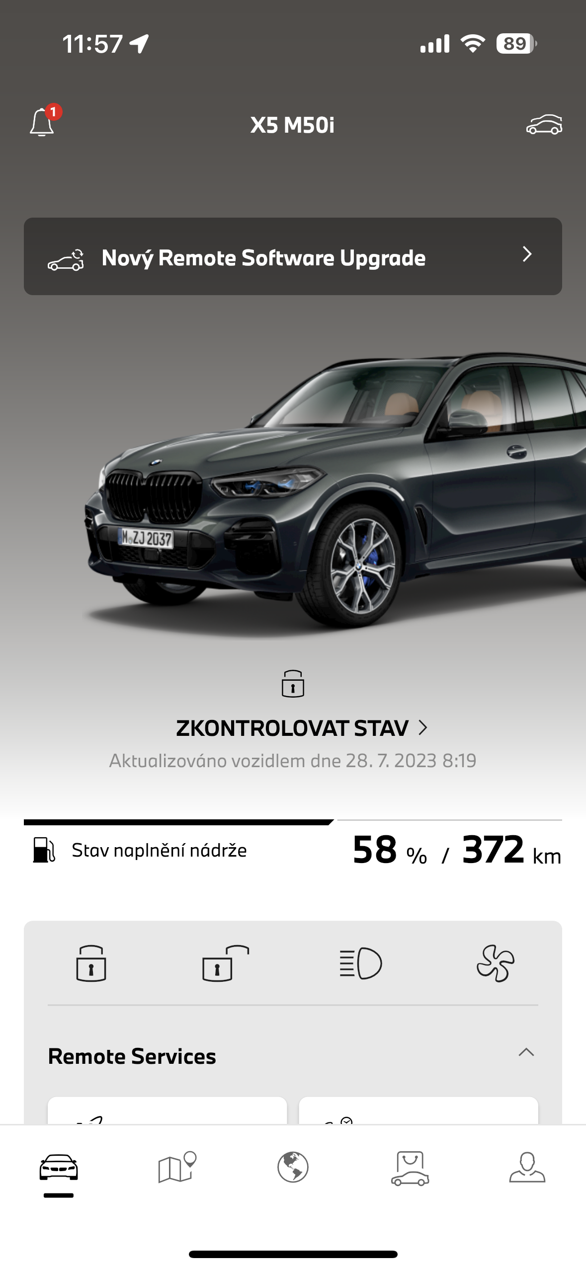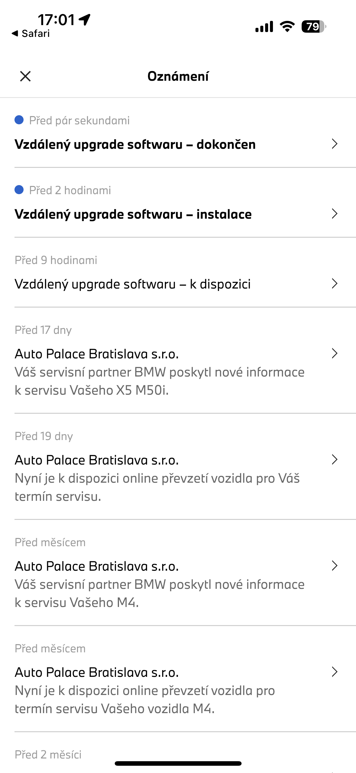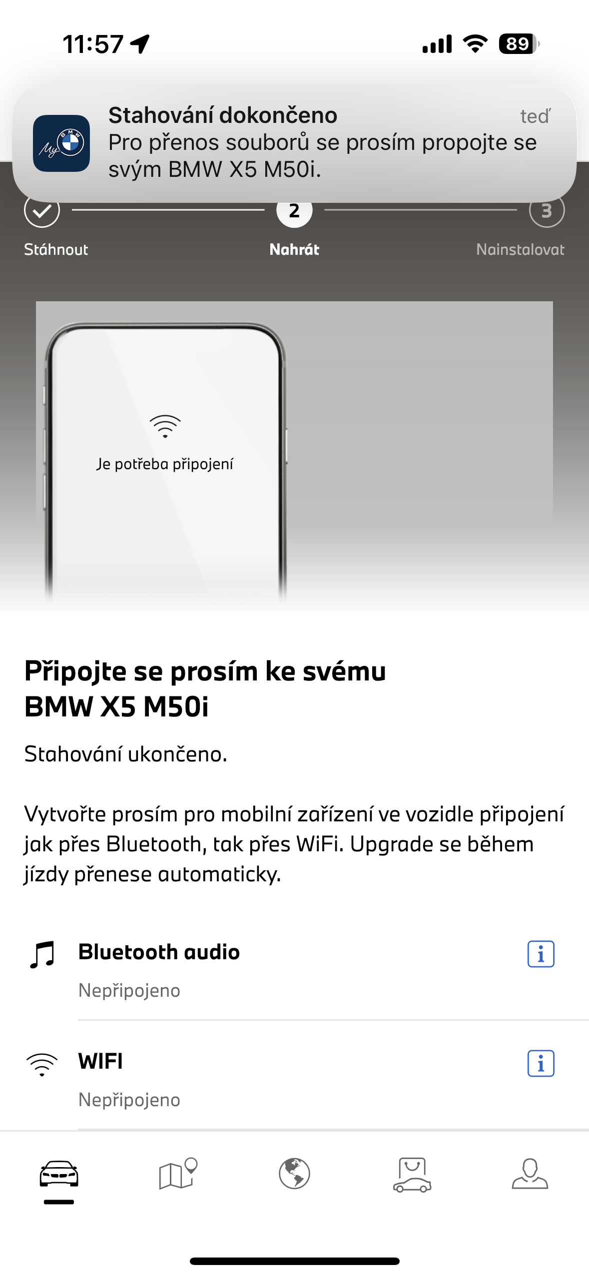 Jakmile vyjde nějaká aktualizace software pro vás vůz, aplikace vás sama upozorní pomocí notifikace na to, že je dostupný upgrade software. Jakmile vám tato notifikace dojde, můžete software nechat automaticky stáhnout do vašeho telefonu přes Wi-Fi nebo mobilní data. Software se stáhne do telefonu a při další jízdě se z telefonu přes Wi-Fi  nahraje do vozu, kde se automaticky objeví informace o tom, že můžete při opuštění vozu spustit aktualizaci software.