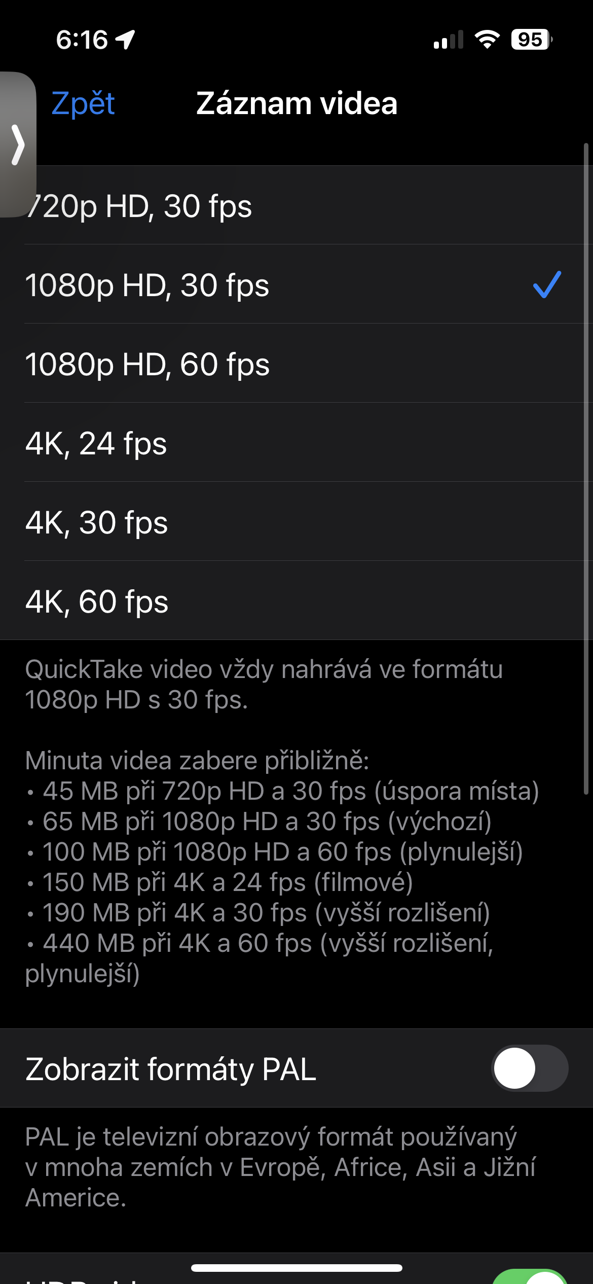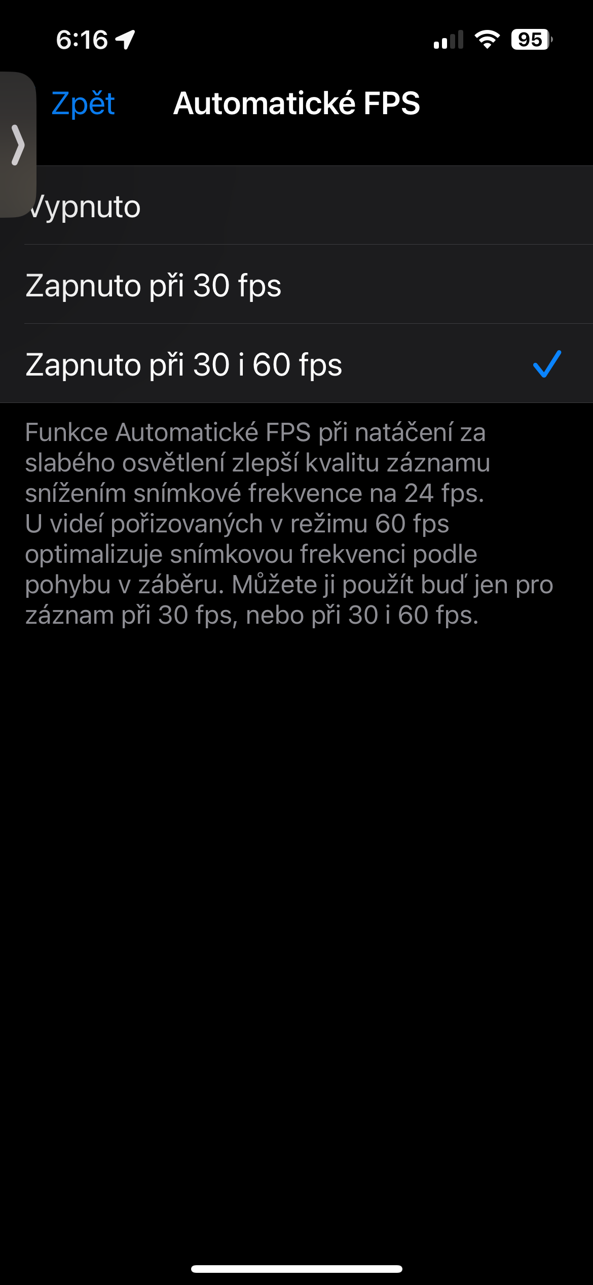 • Pokud máte iPhone 12 a novější, klepněte na Automatické FPS a aktivujte možnost Zapnuto při 30 i 60 fps.