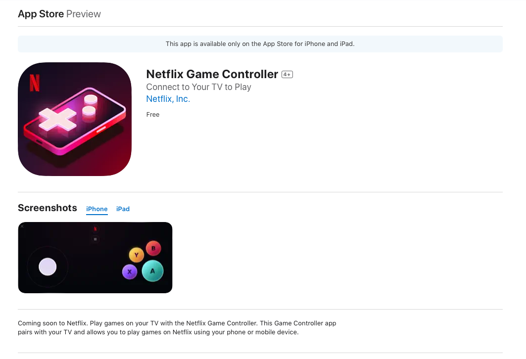 Společnost Netflix vydala aplikaci Netflix Game Controller, která má uživatelům zprostředkovat herní zážitky Netflixu na jejich televizorech. V popisu na App Store se uvádí, že aplikace Game Controller se spáruje s televizorem a umožní hraní Netflix her pomocí telefonu nebo mobilního zařízení.