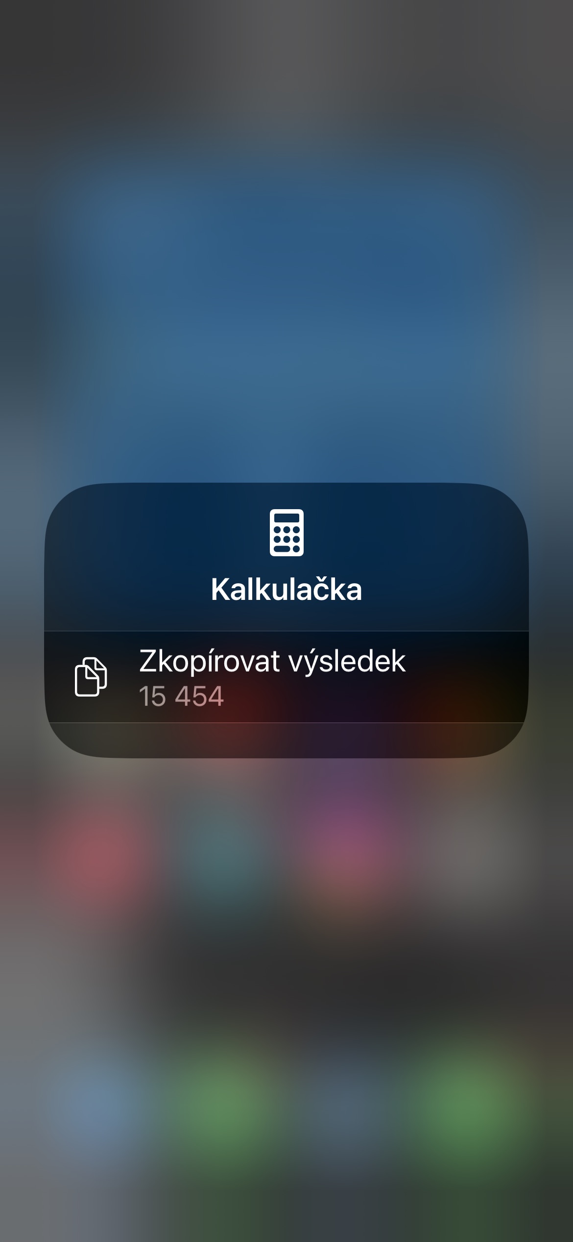 Překvapivou možnost nabízí i dlaždice nativní Kalkulačky v Ovládacím centru. Schválně zkuste aktivovat Ovládací centrum a dlouze tuto dlaždici stisknout – uvidíte, že se vám zobrazí menu s možností rychlého zkopírování posledního výsledku – výsledek se z pochopitelných důvodů neuloží v případě, že jste obsah displeje v Kalkulačce promazali.