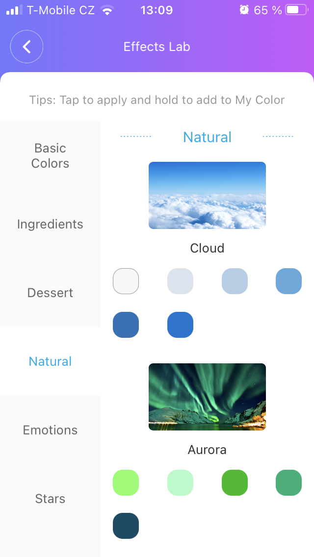 Konečně samotné ovládání světla skrze aplikaci je díky vizuálně poutavému rozhraní, i když je v angličtině, opravdu jednoduché a zábavné, přičemž nastavovat lze buď obě světelné tyče zároveň nebo každou zvlášť. Snad jen jednotlivé ovládací prvky by mohly být trochu větší, pročež by svými rozměry mohly lehce potrápit uživatele s většími prsty. Využití Govee Home poměrně citelně rozšiřuje možnosti nastavení. Ikona Efekt Lab skrývá skutečně úctyhodný počet odstínů barev, jež jsou vedle těch základních – Basic Colors uspořádány do skupin podle různých prostředí, nálad, ročních období nebo odstínů typických pro určité materiály. Ostatně se 16 miliony barev se není čemu divit.