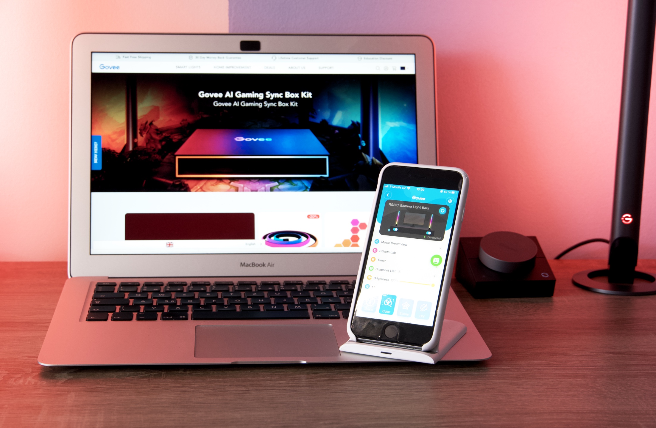 Govee RGBIC Wi-Fi Gaming Light Bars je poměrně unikátní světelné řešení vašeho herního, či pracovního prostoru s ovladačem, pomocí kterého lze rychle a jednoduše přistupovat k základnímu nastavení jako je vypnutí či zapnutí systému, výběr barev a intenzity světla. Specialitou je pak tlačítko pro řízení hudbou. Jak již název napovídá oba prvky je také možné ovládat skrze Bluetooth a Wi-Fi 2,4 GHz prostřednictvím aplikace Govee Home dostupné na App Store i Google Play.