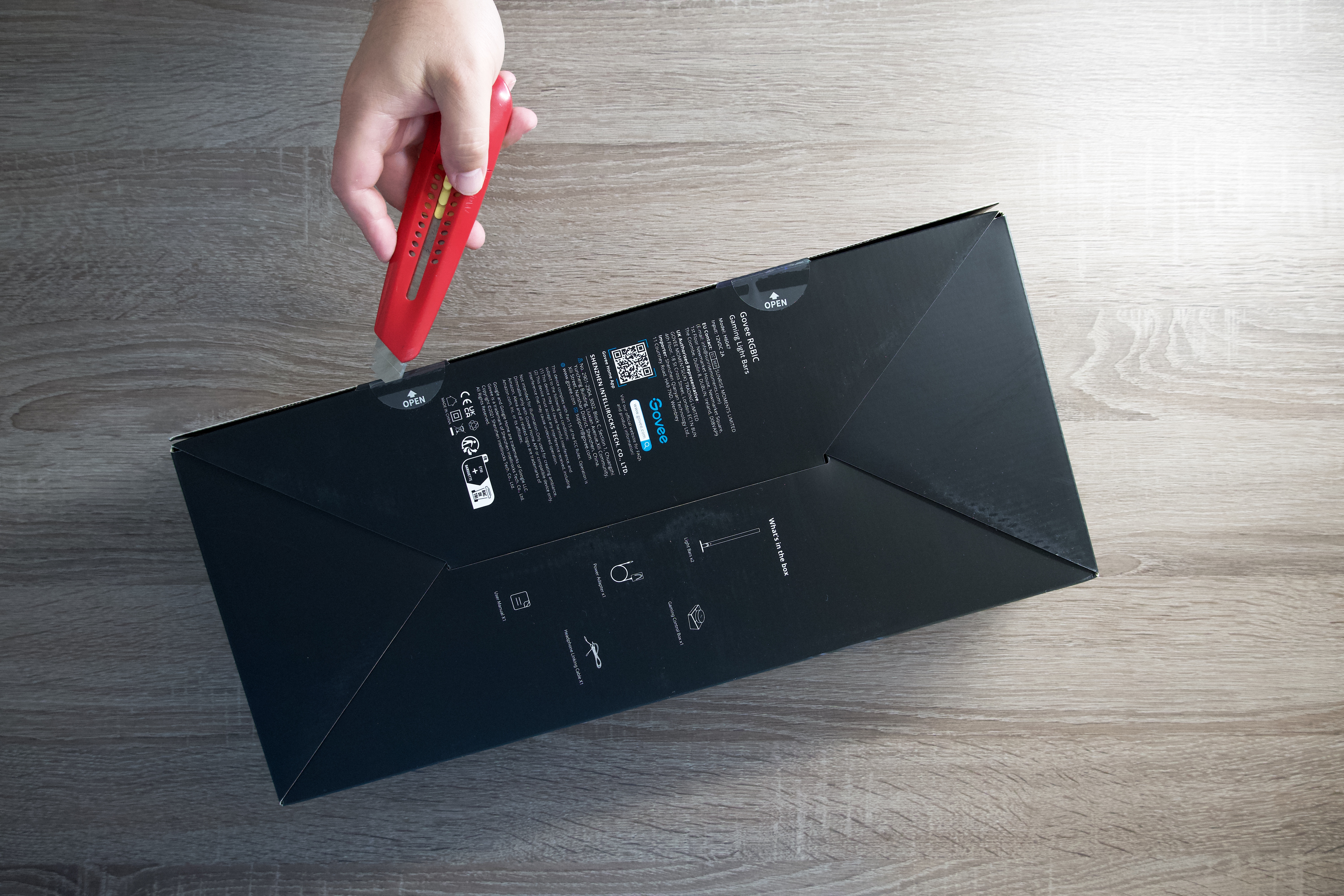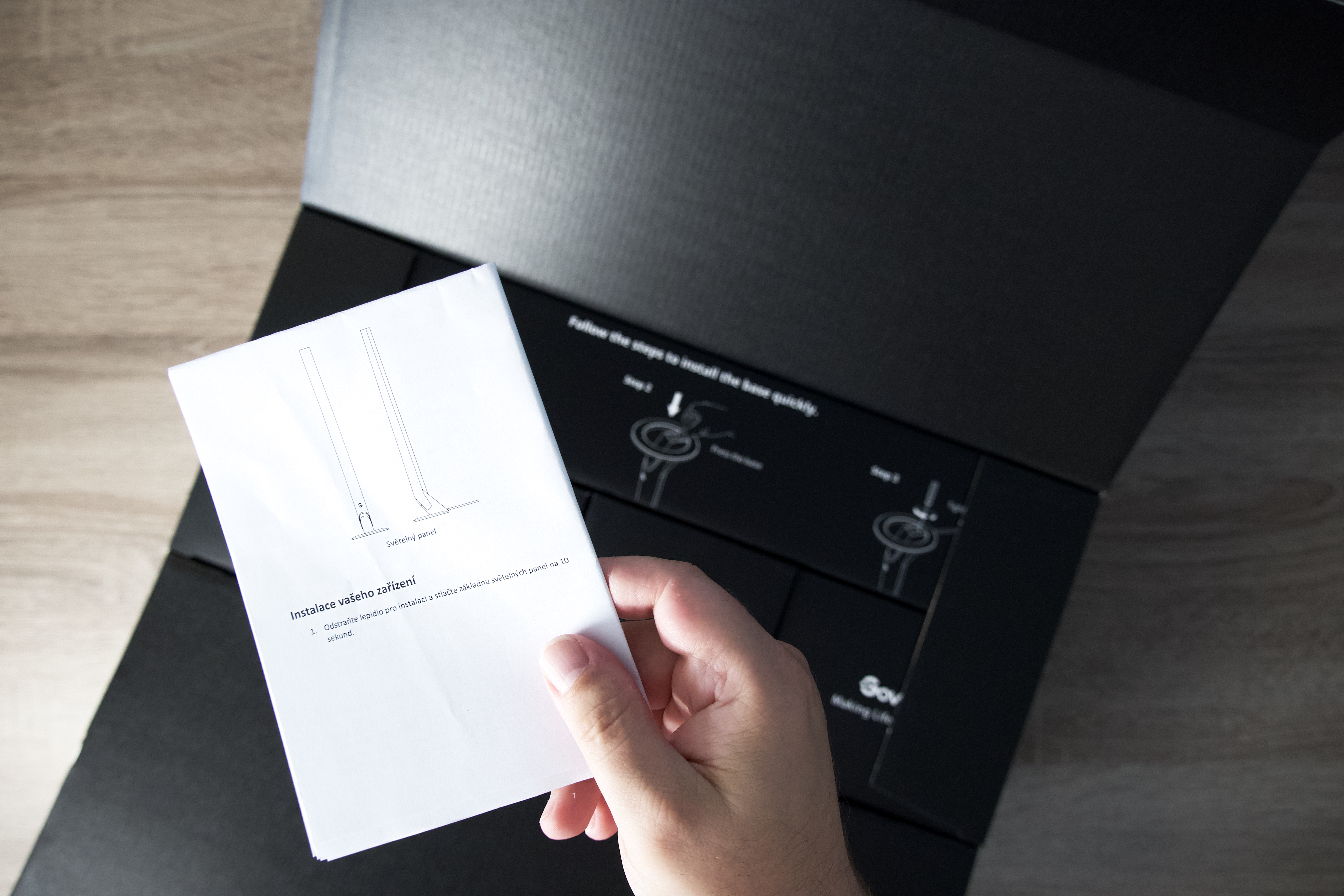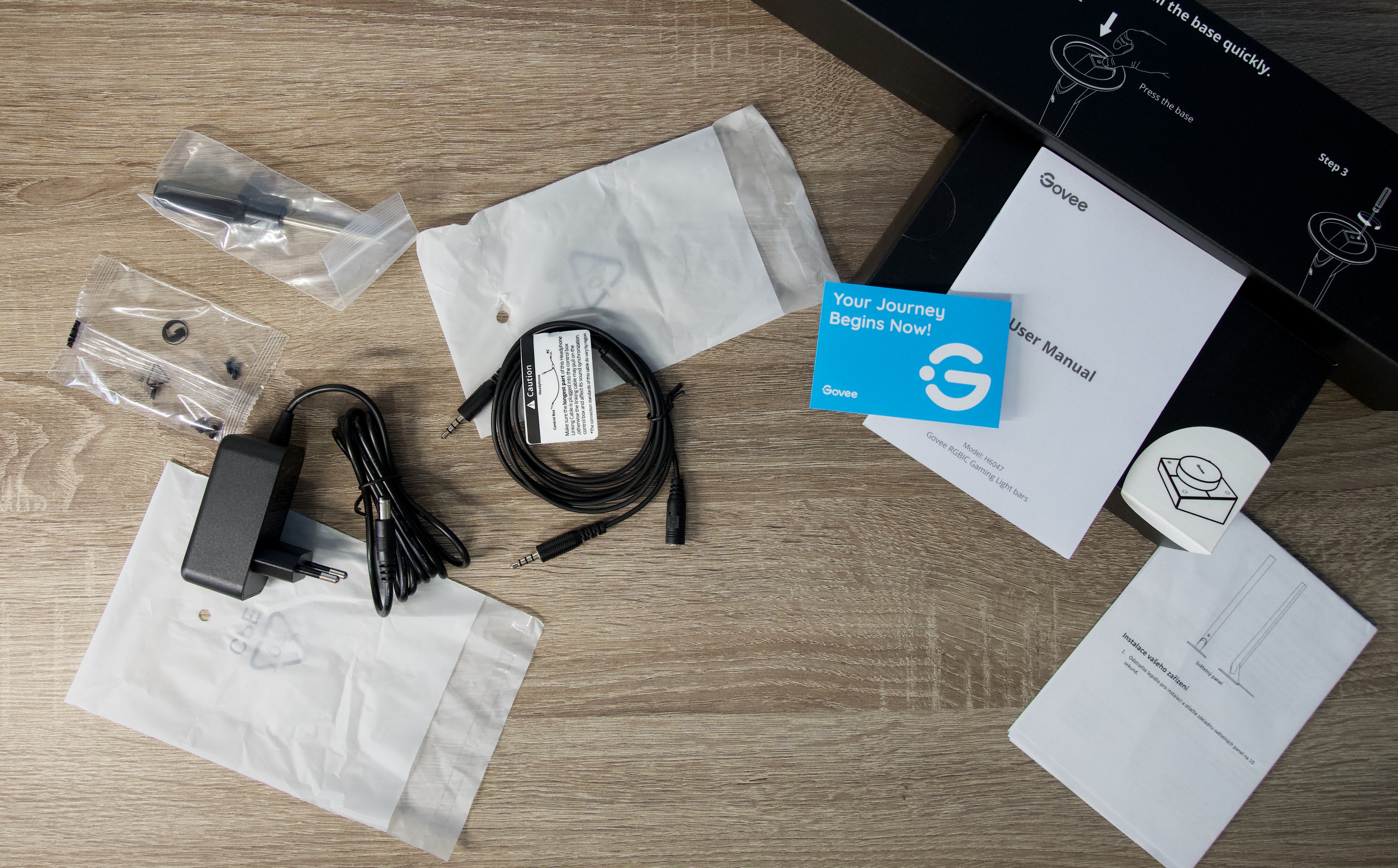 Ne příliš velká černá krabice s efektním potiskem v sobě ukrývá další 3 menší, z nichž nejmenší obsahuje 12V napájecí adaptér, sadu 6 malých šroubků, odpovídající šroubovák a konečně kabel, který lze připojit k audio výstupu vašeho počítače pomocí 3,5mm Jack konektoru, ale zároveň disponuje rozbočkou, díky níž může světelná show pokračovat, i když si nasadíte sluchátka. V co do velikosti prostřední krabičce najdete chytrý ovladač a 2 kruhové podstavy pro obě světla. Prostor posledního a největšího boxu s potiskem jednoduchého postupu montáže zaujímají samotné světelné tyče s napevno umístěnými kabely opatřené konektorem USB a praktickou stahovací páskou usnadňující organizaci.
