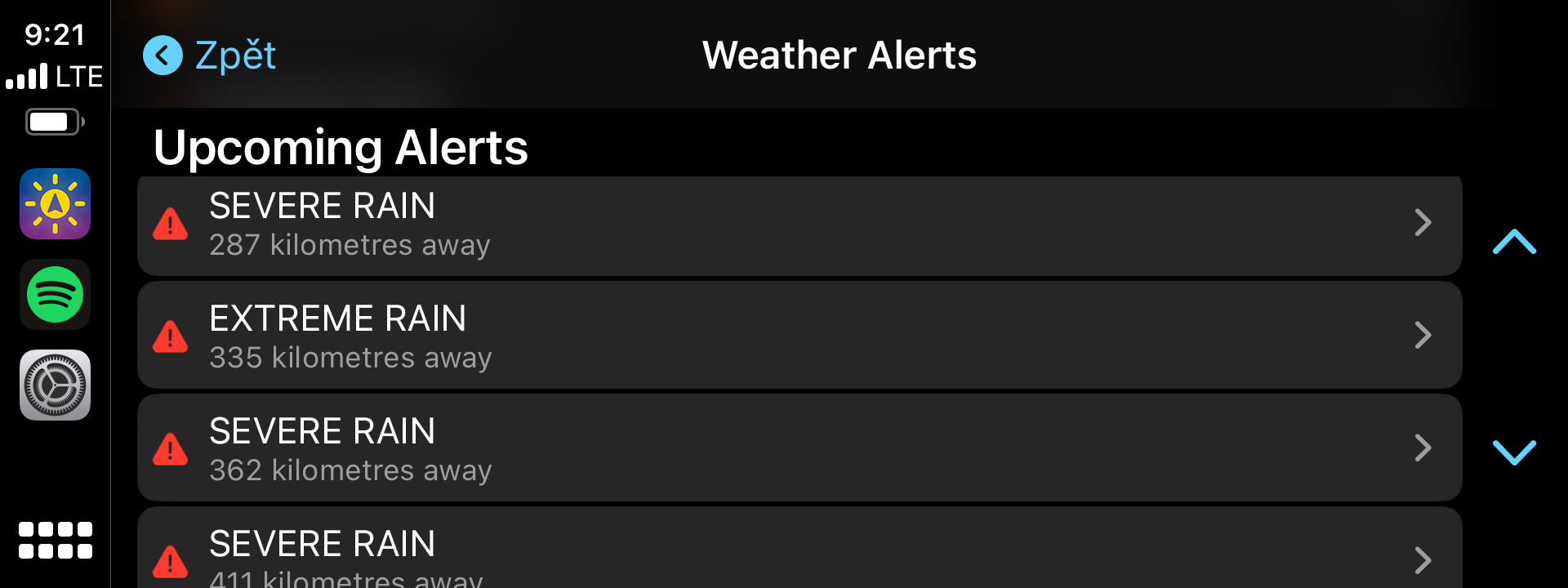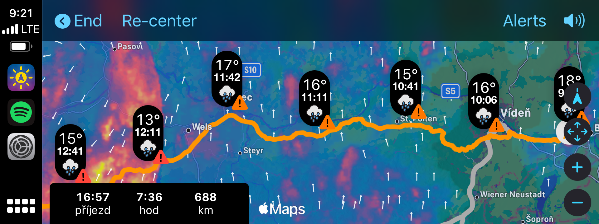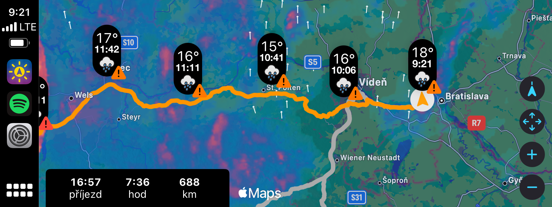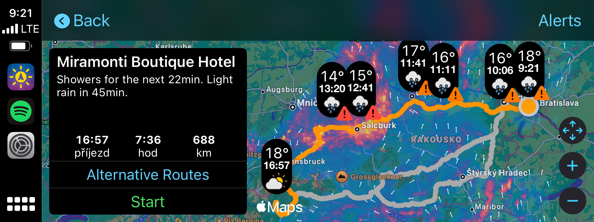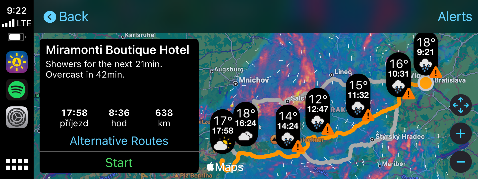 Pokud cestujete svým vozem na delší vzdálenosti, obzvlášť pak například do Itálie nebo Francie přes Alpy, zřejmě se stejně jako většina řidičů obáváte nepřízně počasí. Ať už je to hustý déšť, který není nic příjemným, nebo dokonce kroupy, které dokáží zničit váš vůz, hodilo by se každému nepříznivému počasí na cestě vyhnout, co říkáte? A právě od toho je tu aplikace OnTheWay. Ta totiž využívá Apple Maps a zároveň předpověď počasí společně s daty z Meteoradaru a dokáže vám říct, na jaké počasí během vaší cesty narazíte.