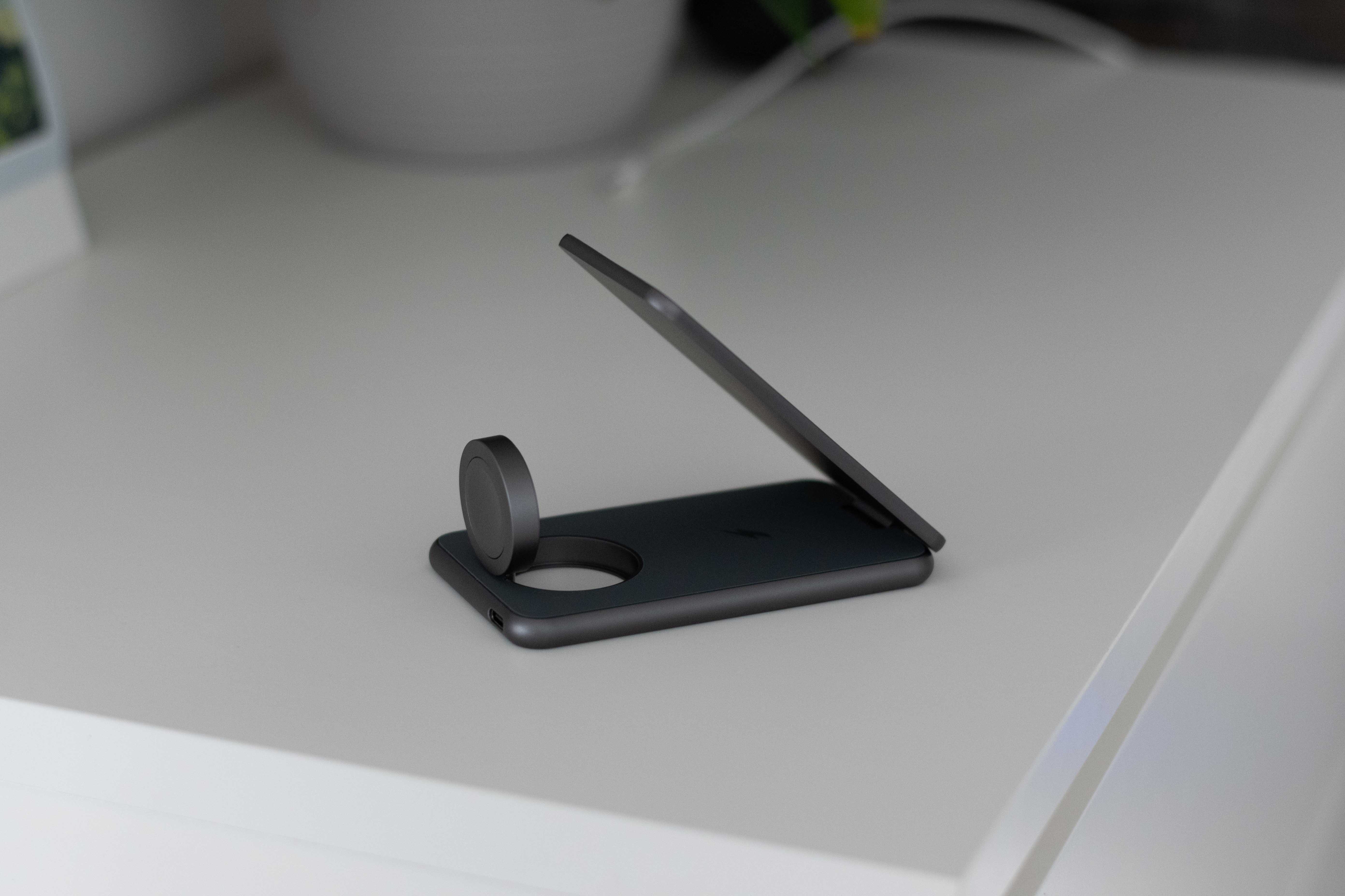 Zatímco na produktových fotkách je nabíječka poměrně světlá, musím říci, že v reálu nemá příliš daleko do vesmírně šedé z dílny Applu, což osobně kvituji. Totéž pak musím říci i o její celkové konstrukci, která je za mě zkrátka super. Nabíječka se totiž skládá ze základny, do které je implementován nabíjecí puk pro Apple Watch spolu s Qi cívkou pro AirPods či jinou elektroniku, a na kloubu umístěné nabíjecí plochy pro smartphone, kterou si lze nastavit dle vašich preferencí. Pokud tedy chcete telefon nabíjet naležato, není problém. Pokud naopak prahnete po nabíjení v 90 stupních, taktéž to není problém, stejně jako jde samozřejmě nabíjecí rameno nastavit tak, aby byl váš telefon „položen“ třeba v 60stupňovém či jiném náklonu a vy byste tak na něj viděli dobře de facto kdykoliv. A díky nasazení magnetu si můžete být i při kolmé poloze telefonu jisti tím, že jej magnety podrží a tedy nehrozí jeho pád. Nicméně rozhodně neplatí, že je MagSafe zároveň podmínkou k funkčnosti nabíječky, jelikož tomu tak skutečně není! Máte-li tedy starší iPhone či jiný telefon s podporou bezdrátového nabíjení, pokud si nabíjecí plochu v rameni nastavíte tak, aby z ní telefon nesjel, nebudete mít s nabíjením sebemenší problém.
