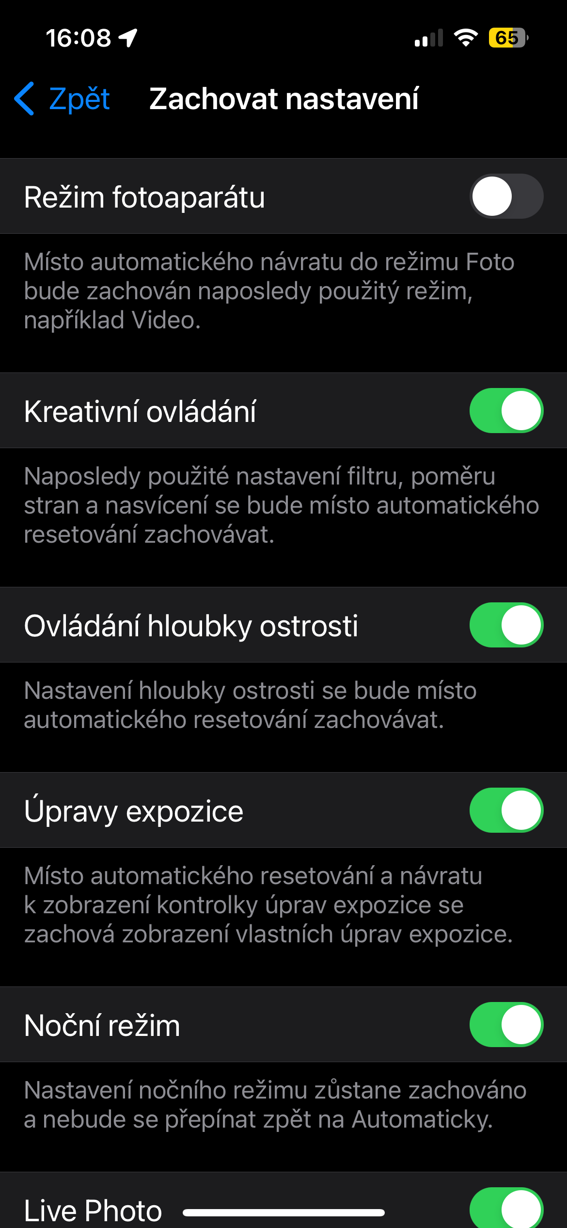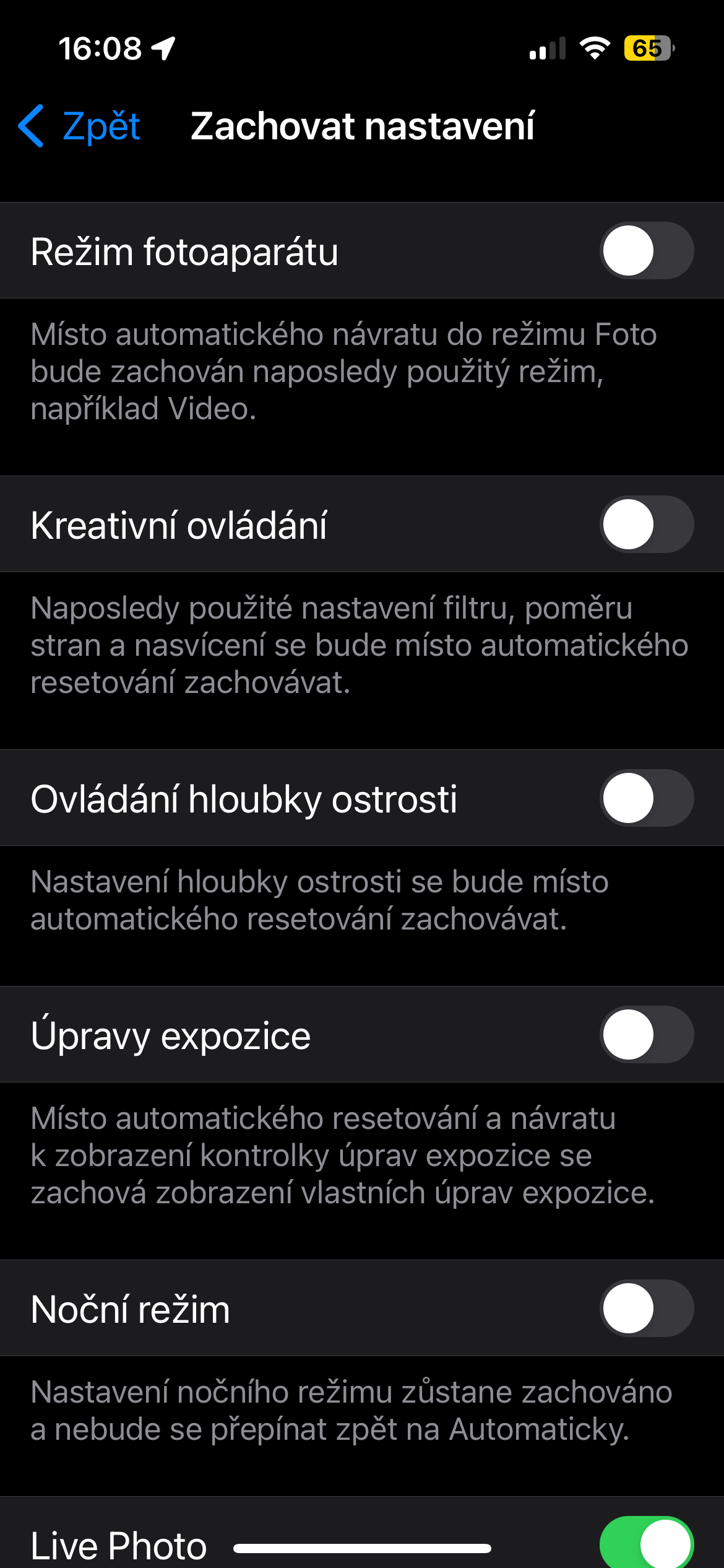 Ať už jste profesionál, nebo začátečník, jistě uvítáte možnost uložení nastavení fotoaparátu vašeho iPhonu. Tato funkce se vám může hodit, když budete fotografovat. Kromě toho může ušetřit váš drahocenný čas, protože zajistí, že nebudete muset pokaždé dolaďovat nastavení a riskovat, že přijdete o krásný okamžik, který jste chtěli zachytit. Přejděte do aplikace Nastavení v iPhonu -> Fotoaparát -> Zachovat nastavení. Na této obrazovce byste měli vidět několik nastavení, včetně režimu fotoaparátu, kreativních ovládacích prvků, úpravy expozice a živých fotografií. Nyní zkrátka jen zapněte přepínače vedle jednotlivých možností v závislosti na svých potřebách.