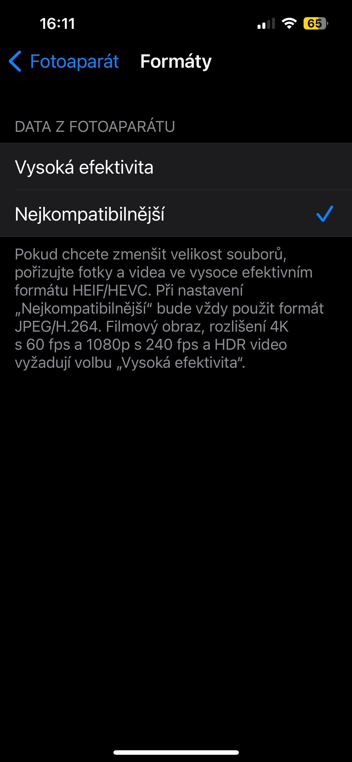 Přestože nelze popřít, že formát HEIF je efektivnější, není všude podporován. Možná budete chtít nastavit aplikaci fotoaparátu tak, aby na vašem iPhonu automaticky pořizovala fotografie ve formátu JPEG namísto HEIF. Přejděte do aplikace Nastavení -> Fotoaparát -> Formáty a vyberte možnost Nejkompatibilnější.