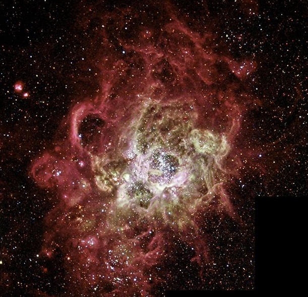 Nový složený snímek kombinuje pohledy obou Webbových přístrojů a odhaluje jak zeleně a žlutě zabarvené víry plynu a prachu, tak i jasně červené oblasti tvorby hvězd v galaxii. Vědci doufají, že další studie NGC 6822 mohou vrhnout více světla na to, jak vznikly první galaxie ve vesmíru a jak vlastně vypadaly.