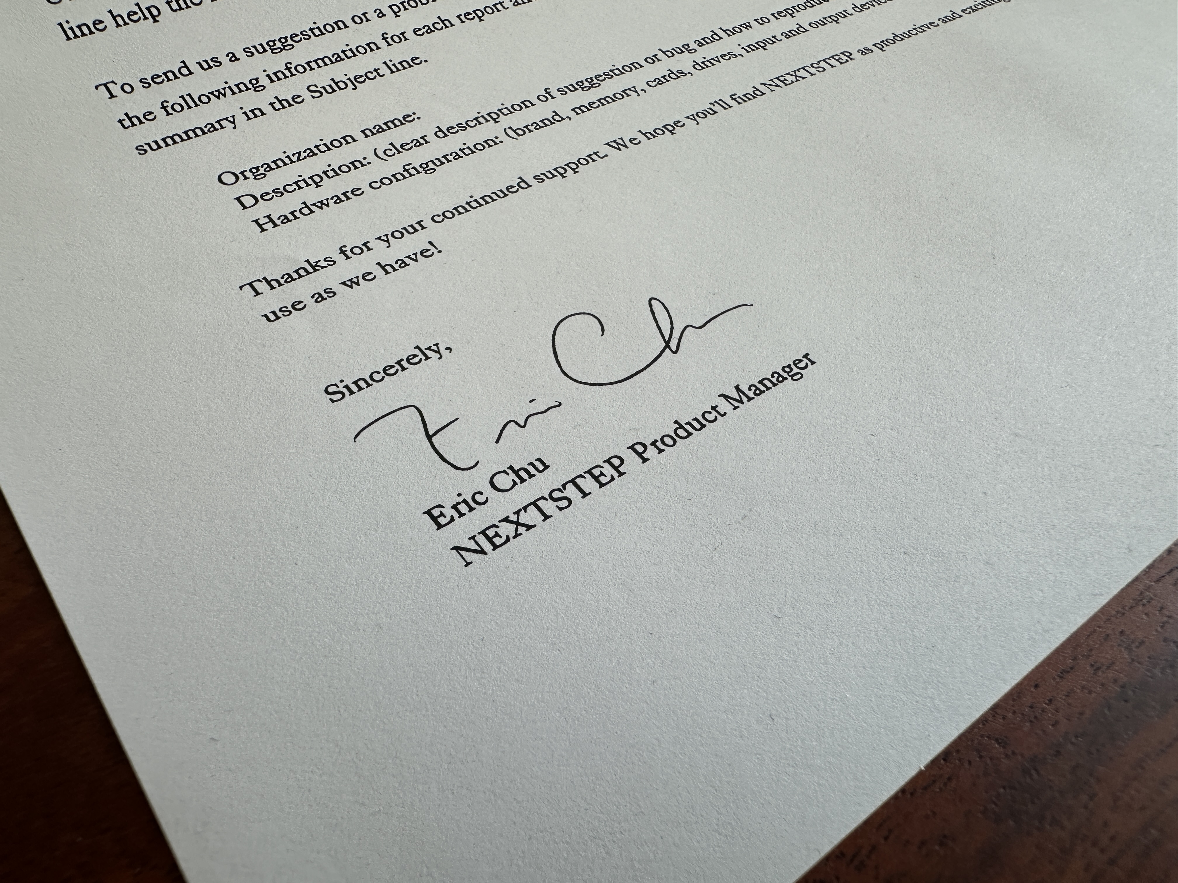 K mému obrovskému nadšení se mi pár týdnů zpět ozval jeden z našich čtenářů, který mi nabídl originální NeXTSTEP ACADEMIC BUNDLE ve verzi 3.2 v kompletním balení včetně všech dokumentů, mezi nimiž je i děkovný dopis od šéfa vývojového týmu NeXT STEP, kterým byl Eric Chu, jenž spadal přímo pod Steva Jobse. Neváhal jsem a okamžitě jsme se dohodli, za což chci ještě jednou poděkovat. Doma mi tak přistál balíček s kompletním balením software a když říkám kompletním, myslím tím skutečně se vším co k tomu patří. V roce 1993 kdy konkrétně tato verze 3.2 vyšla, totiž bylo zvykem vám kromě disket a CD přibalit minimálně pět knih, několik dopisů, předobjednávek na merch a další software a to vše zabalit do úhledné krabice.
