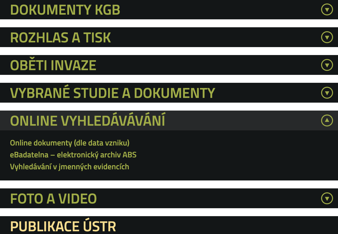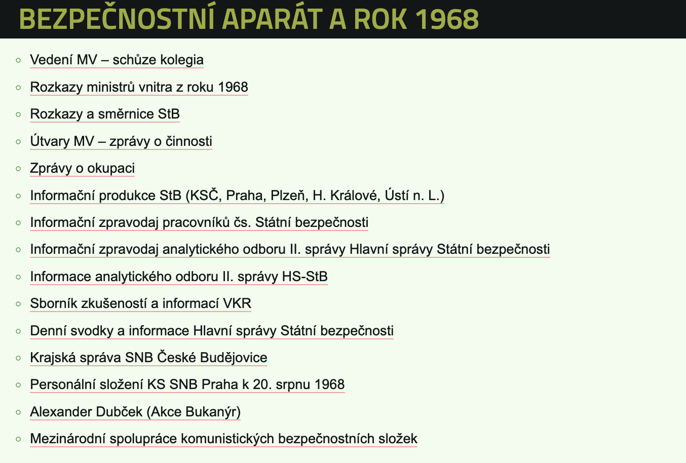 Na webové stránce ROK 1968, která je součástí oficiálního webu ÚSTR, najdete kategorie s názvy Bezpečnostní aparát, Rozhlas a tisk, Oběti invaze, publikace a dokumenty. Názvy jednotlivých kategorií jistě hovoří jasně samy za sebe – v sekci Bezpečnostní aparát a rok 1968 najdete například zprávy o okupaci, přehled denních svodek Hlavní správy Státní bezpečnosti, zápisy ze schůzí nebo informace o personálním složení KS SNB Praha k 20. srpnu 1968. Na webu nechybí dále třeba informační zprávy KGB, působivé záznamy tehdejšího vysílání tuzemského i zahraničního rozhlasu, obsáhlá fotogalerie, videoarchiv, ale třeba také dobový záznam pohřbu Jana Palacha. Poslední sekce je věnována přehledu publikací ÚSTR, které jakýmkoliv způsobem souvisí s událostmi srpna 1968.