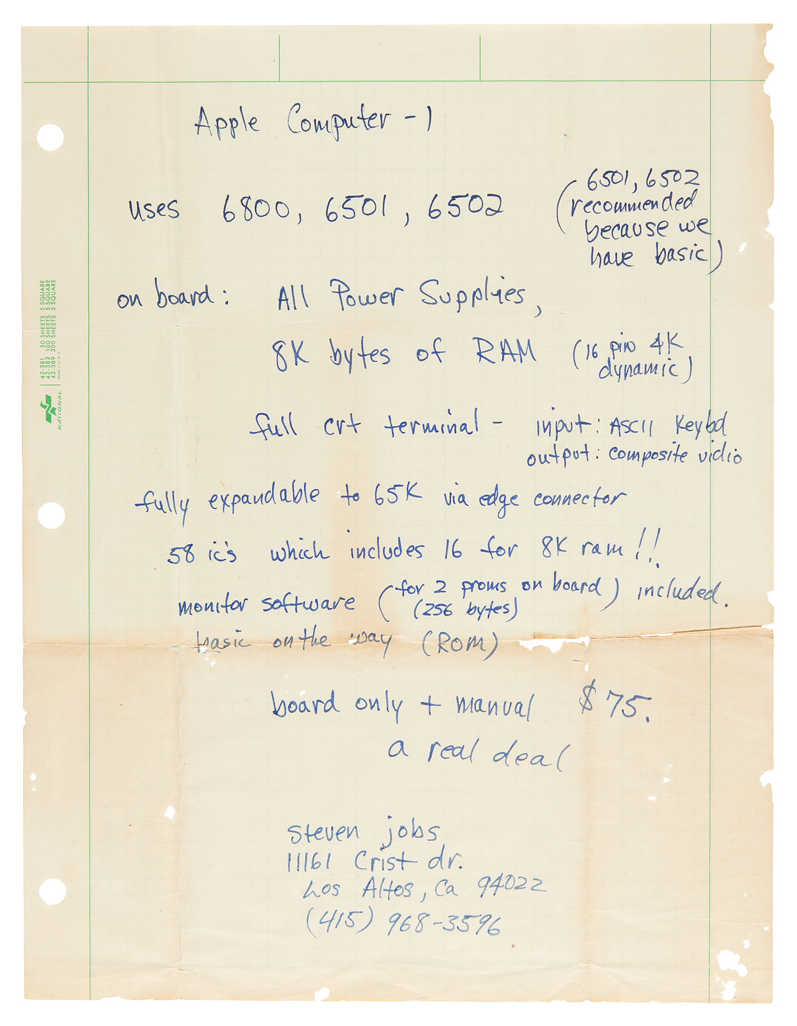 Koncept zmiňuje některé technické parametry jako např. 8k RAM, rozšiřitelnost nebo zahrnutí manuálu. Nechybí samozřejmě ani údaj o ceně a pobídka ke koupi: „…75 dolarů. Skvělá nabídka,“ zní část textu, který Jobs napsal. Nechybí jeho podpis a uvedenou adresou je dům jeho rodičů, kde Apple vznikal.