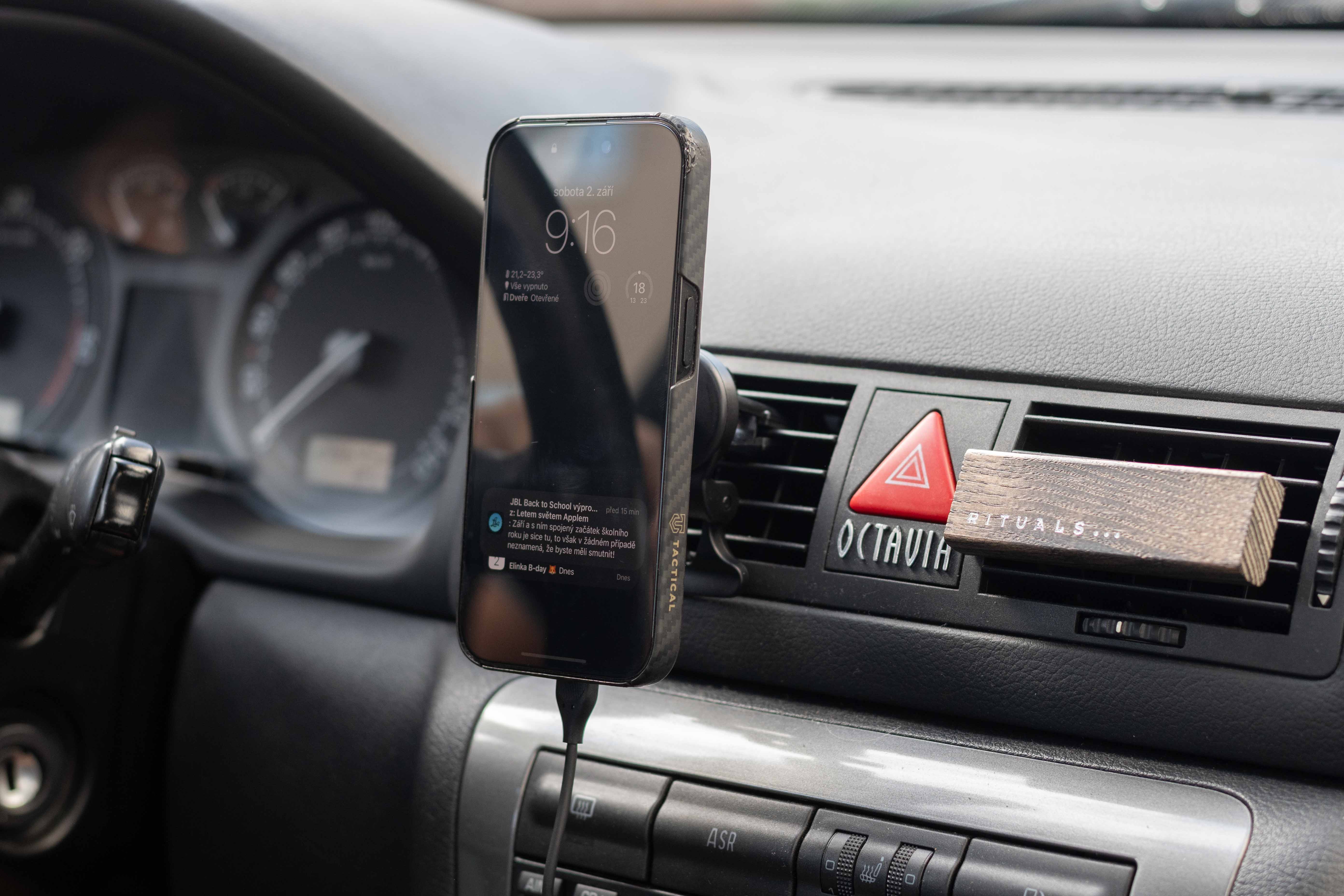 Ještě než se pustím do rozboru toho, jak se vlastně nabíječka v reálném životě používá, je třeba se podívat na její technické specifikace, které jsou samozřejmě při výběru velmi důležité. Jak již název napovídá, jedná se konkrétně o bezdrátovou nabíječku s velmi tenkým tělem, která je vybavena magnetem pro magnetické přichycení iPhonů 12 a novějších pomocí MagSafe konektoru, potažmo jiných telefonů přes magnetické obaly. Nabíječka se připevňuje na plastový „kloub“ s čelistmi na druhé straně, kterými se přichycuje do mřížky ventilace. O tu se následně ještě „opře“ díky polohovatelnému plastovému ramenu, čímž získá potřebnou stabilitu, což je rozhodně fajn. O napájení nabíječky se stará klasický nabíjecí adaptér do zapalovače vozu v kombinaci s metrovým USB-C/USB-A kabelem, přičemž oba tyto prvky jsou samozřejmě součástí balení.