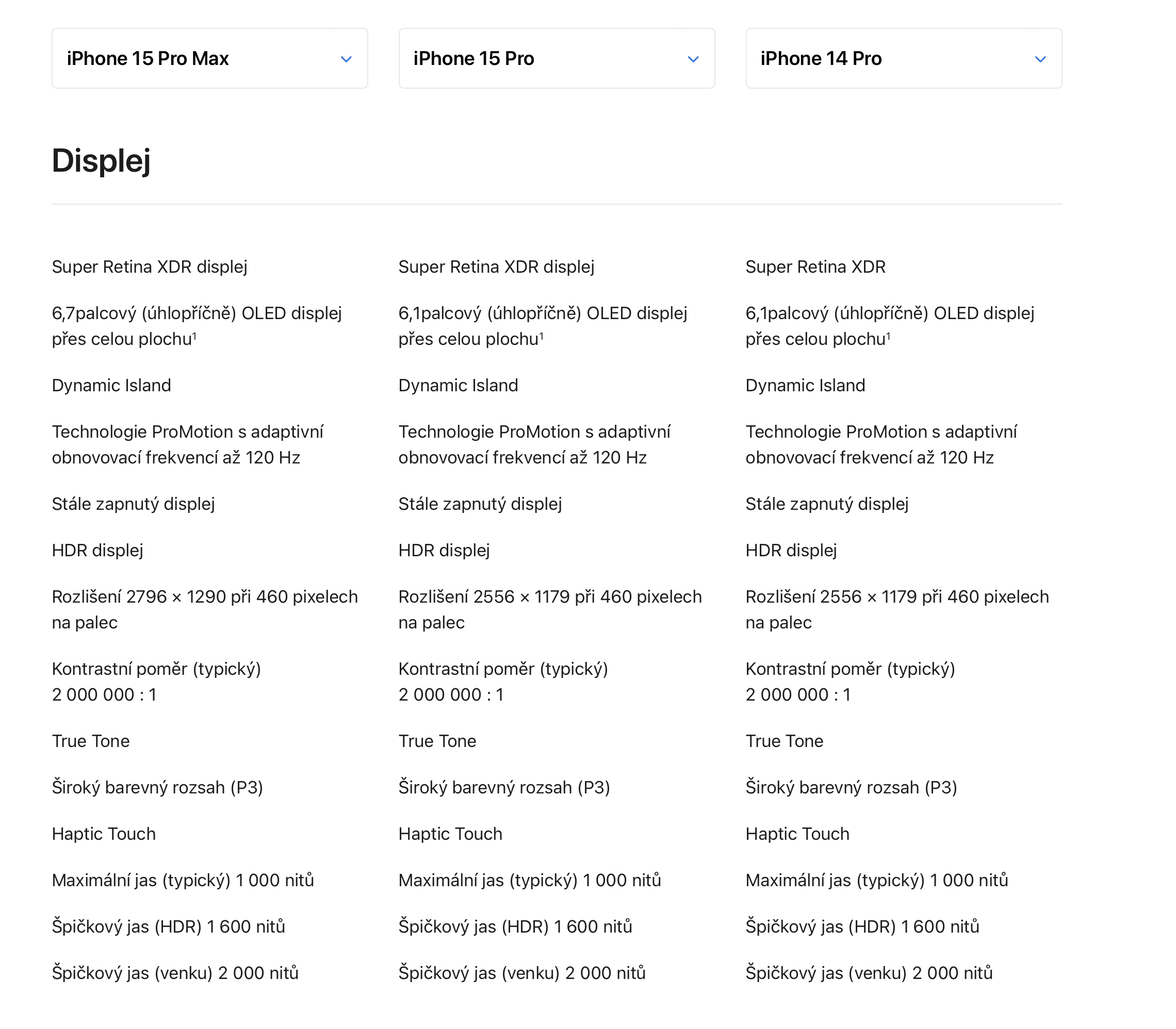 Ačkoli jsme to psali již v článku o představení, v komentářích se objevují chybné příspěvky o tom, že displej iPhone 15 Pro je lepší než displej iPhone 14 Pro. Apple sice použil pro displej u iPhone 15 Pro nový název, ovšem to je také jediné, čím se liší a to ještě pouze tím, že za název super Retina XDR, doplnil Apple u nových modelů slovo displej. Jak iPhone 14 pro tak iPhone 15 Pro mají naprosto stejné displeje, jak můžete vidět níže na screenshotu ze srovnání modelů, které nabízí Apple na svém webu.