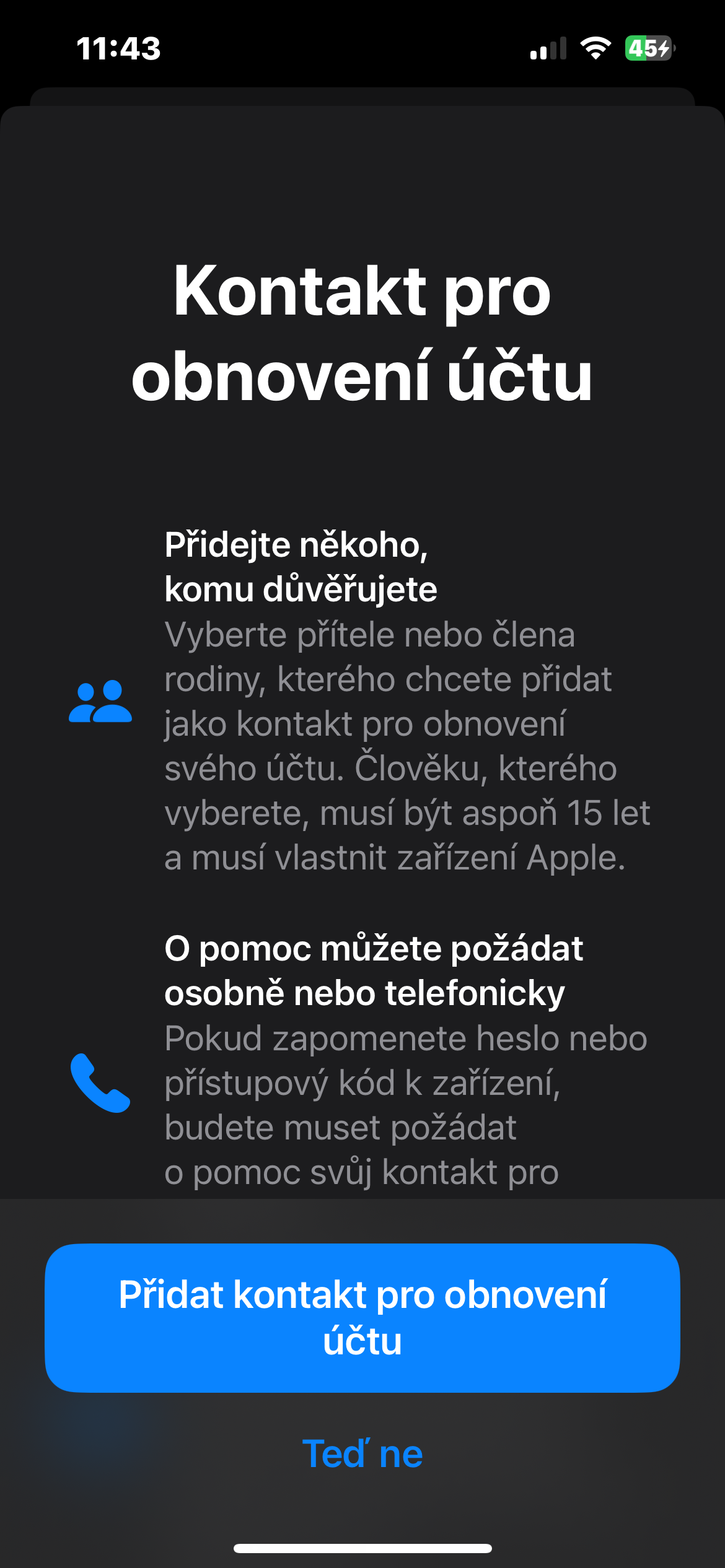 Kontaktní osobou pro obnovení léčby by měla být osoba, kterou znáte a které důvěřujete, například člen rodiny nebo blízký přítel. Bude potřebovat vlastní zařízení se systémem iOS 15 nebo iPadOS 15 nebo novějším a musí být starší 13 let. Bude také potřebovat zapnuté dvoufaktorové ověřování pro svůj vlastní účet a nastavený přístupový kód ve svém zařízení.