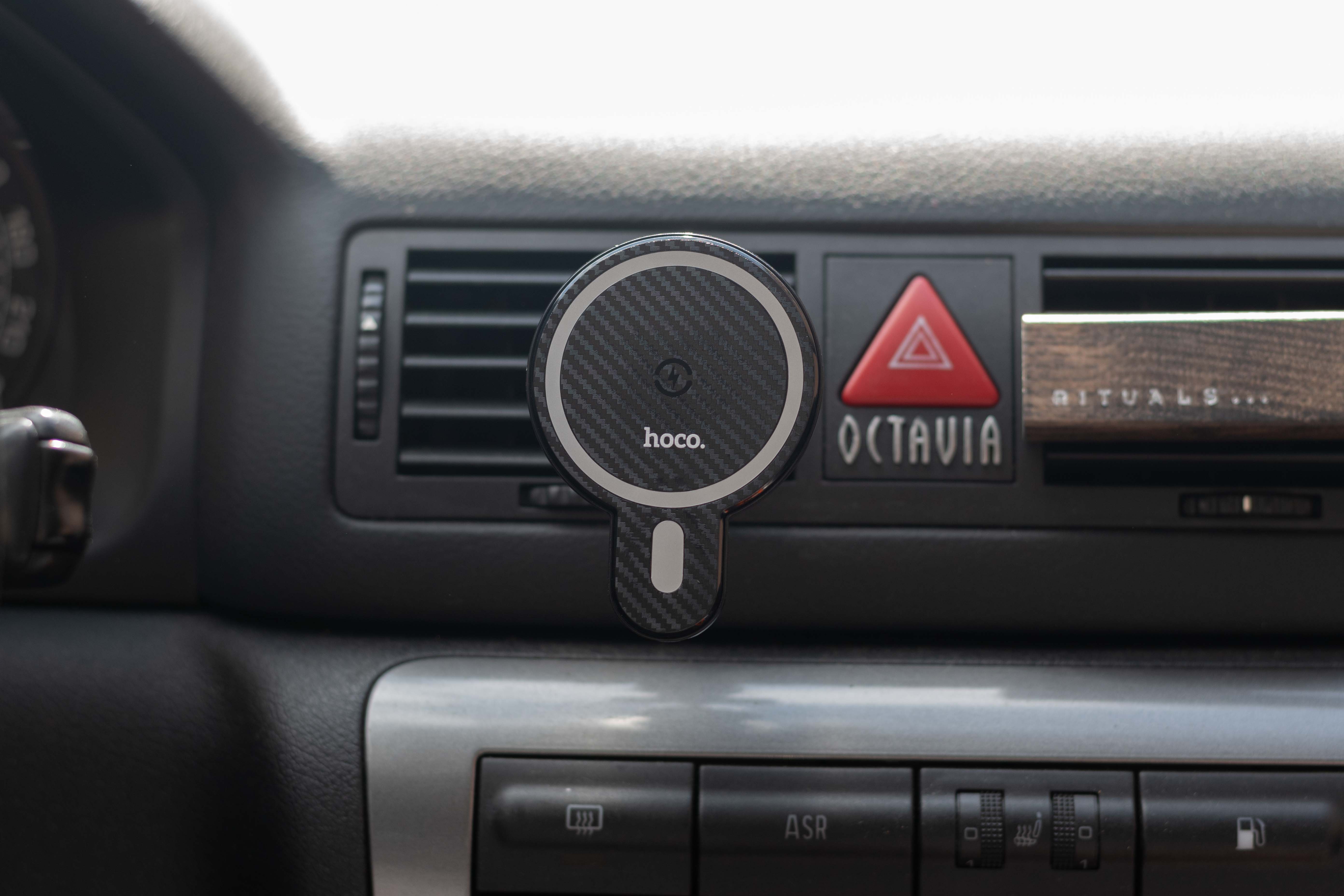 Jak jsem již psal výše, Hoco. CA85 je magnetickou bezdrátovou nabíječkou schopnou nabíjet de facto vše, co k ní přichytíte pomocí magnetismu, primárně pak samozřejmě iPhony s MagSafe. Nabíječka je vyrobena z na omak kvalitního plastu v kombinaci s akrylem, přičemž její povrch nadesignoval výrobce tak, aby vypadal jako karbon, což je dle mého vzhledem k určení do aut naprosto ideální vzor. Nabíječka nabízí maximální výkon 15W, avšak to jen za předpokladu, že na ní budete nabíjet zařízení, které přes Qi tuto hodnotu podporuje. U iPhonů si však musíme i nadále vystačit s klasickými 7,5W, jelikož vzhledem k absenci Made for MagSafe certifikace nic víc nabíječka nezvládá. Na její obranu se nicméně sluší dodat, že tuto certifikaci má jen naprostá hrstka produktů. Pokud vás pak zajímá napájení samotné nabíječky, to je jako již tradičně řešeno přes zásuvku v zapalovači vozu, potažmo přes ve voze. Bohužel, adaptér do zapalovače budete v balení hledat marně, takže na to při koupi myslete. A když už se rozhodnete pro jeho dokoupení a budete chtít nabíječku využívat na maximum, je třeba sáhnout po takovém s podporou Power Delivery alespoň 18W. Pokud vás pak zajímají rozměry nabíječky, ty jsou 85 x 60 x 83 mm.