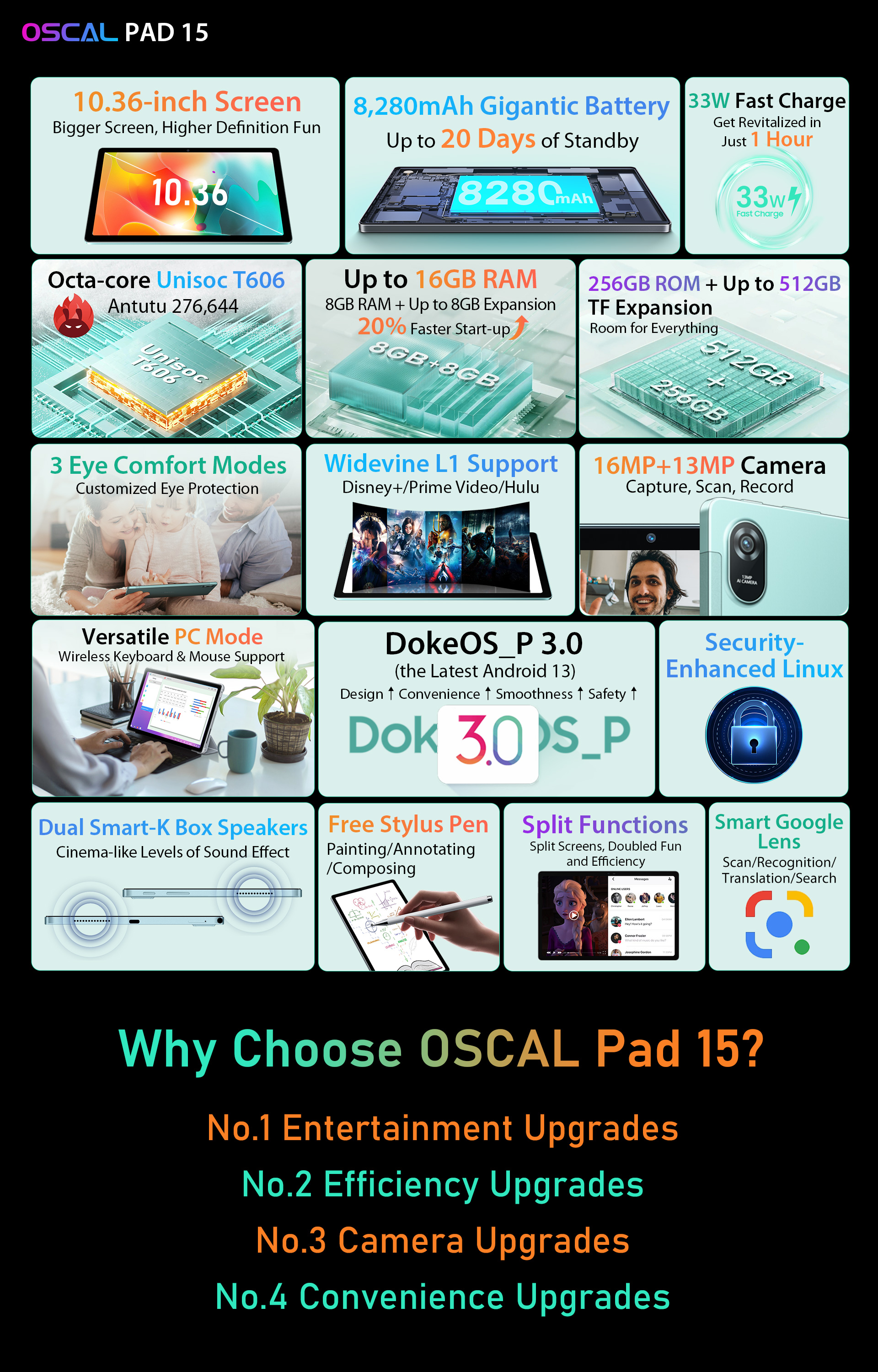 Pad 15 je navržen jako věrný pomocník a díky vylepšením zaměřeným na zábavu, efektivitu, díky fotoaparátu a pohodlí je i nadále zárukou prvotřídní spokojenosti. Novinka exceluje při zvládání každodenních úkolů uživatelů díky působivým integrovaným funkcím, mezi něž patří větší a ostřejší 10,36″ 2K displej, baterie s delší výdrží 8 280 mAh, podpora 33W rychlého nabíjení, až 16 GB RAM a 256 GB ROM, všestranný režim PC Mode přemosťující stůl s notebookem s podporou bezdrátové myši a klávesnice i dotykové obrazovky, přehlednější 16MP+13MP fotoaparáty a systém DokeOS_P 3.0 UI založený na Androidu 13 a ještě více.