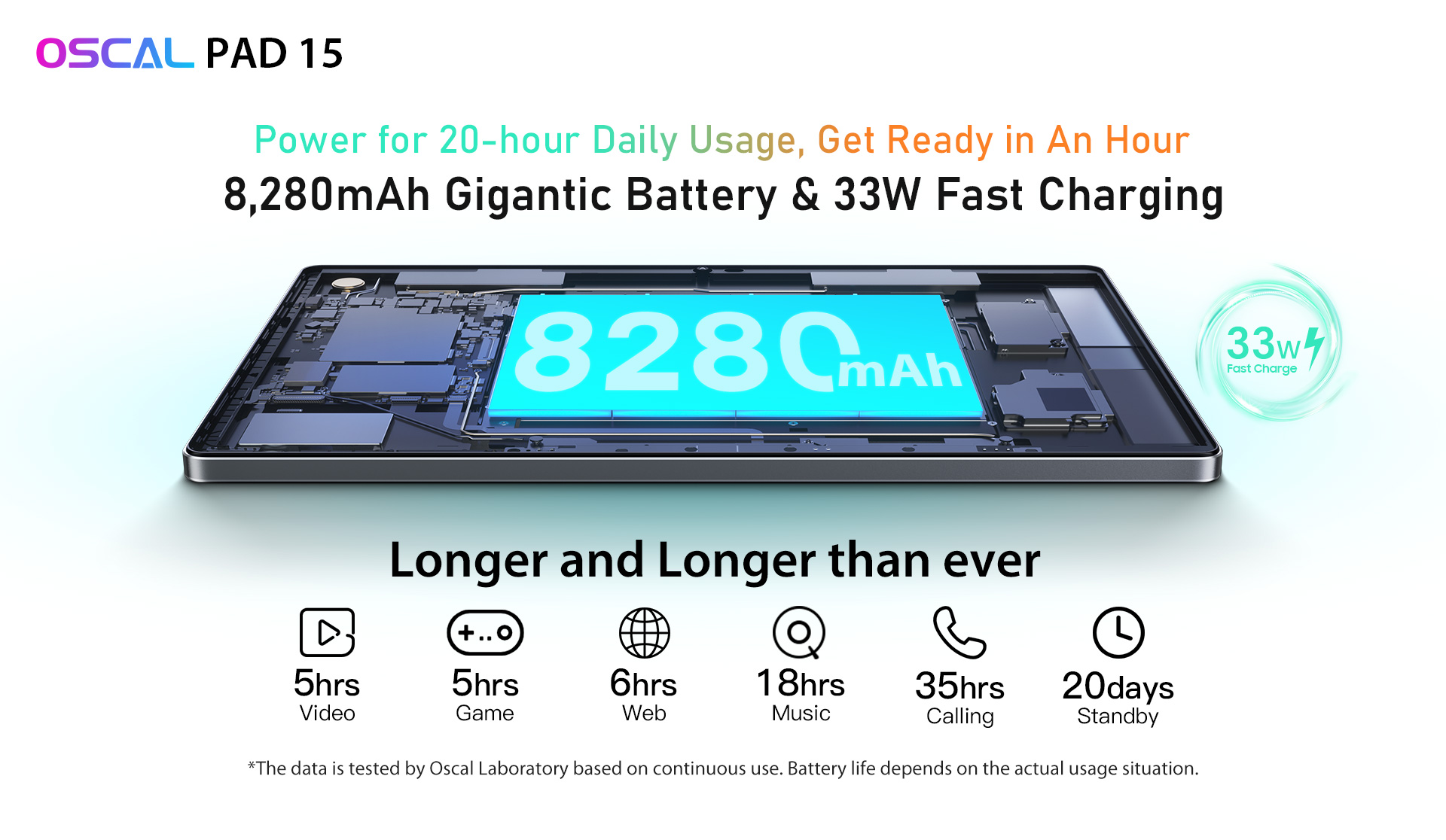 Obětovat kapacitu baterie kvůli přenosnosti? Navzdory své tloušťce 7,6 mm a hmotnosti 449 g se Pad 15 může pochlubit gigantickou baterií s kapacitou 8 280 mAh, která je prozatím vůbec největší mezi zařízeními řady Pad. Podpoří vás až 20 hodinami každodenního používání nebo až 6 hodinami prohlížení webových stránek, když jste uprostřed zábavy nebo vyhledávání informací. Pro zvýšení efektivity nabíjení na cestách podporuje Oscal Pad 15 33W rychlé nabíjení, díky kterému bude Pad 15 připraven k napájení za pouhých 60 minut, což zajistí vaši dlouhotrvající práci, studium i zábavu.