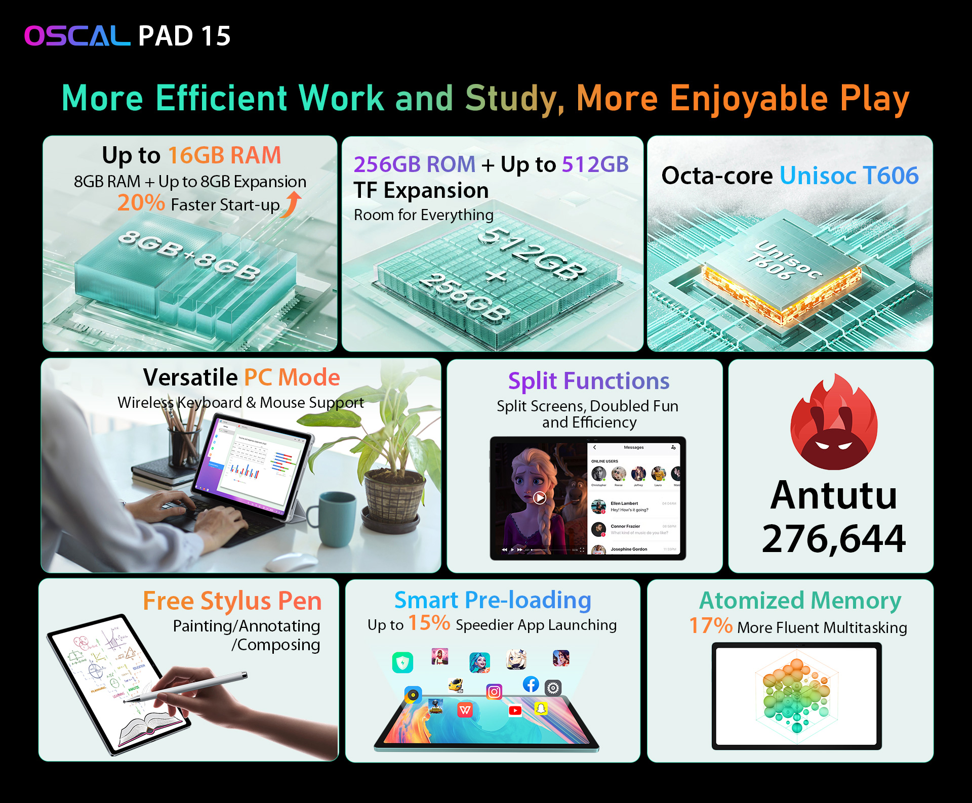 Aby bylo zajištěno svižné posouvání a plynulý multitasking mezi aplikacemi, je Oscal Pad 15 poháněn osmijádrovým procesorem Unisoc Tiger T606, který doplňuje bezproblémový výkon až 16GB pamětí RAM a zrychluje tak spouštění Padu 15 o 20 %. Kromě toho je podpořen systémem DokeOS_P 3.0 založeným na Androidu 13 a pokročilou technologií Smart Pre-Loading, která dále zvyšuje efektivitu díky o 15 % rychlejšímu spouštění aplikací. S využitím technologie Atomized Memory dosahuje Pad 15 o 17 % plynulejšího multitaskingu. Oscal Pad 15 nabízí dostatek prostoru pro elektronické knihy, soubory a aplikace, je vybaven 256 GB paměti RAM, kterou lze dále rozšířit o 512 GB pomocí TF karty. Díky tomu dosáhl Pad 15 v benchmarku Antutu skóre 276 644 bodů. Vezměte si ho, ať už jdete kamkoli, se svými oblíbenými knihami a filmy.