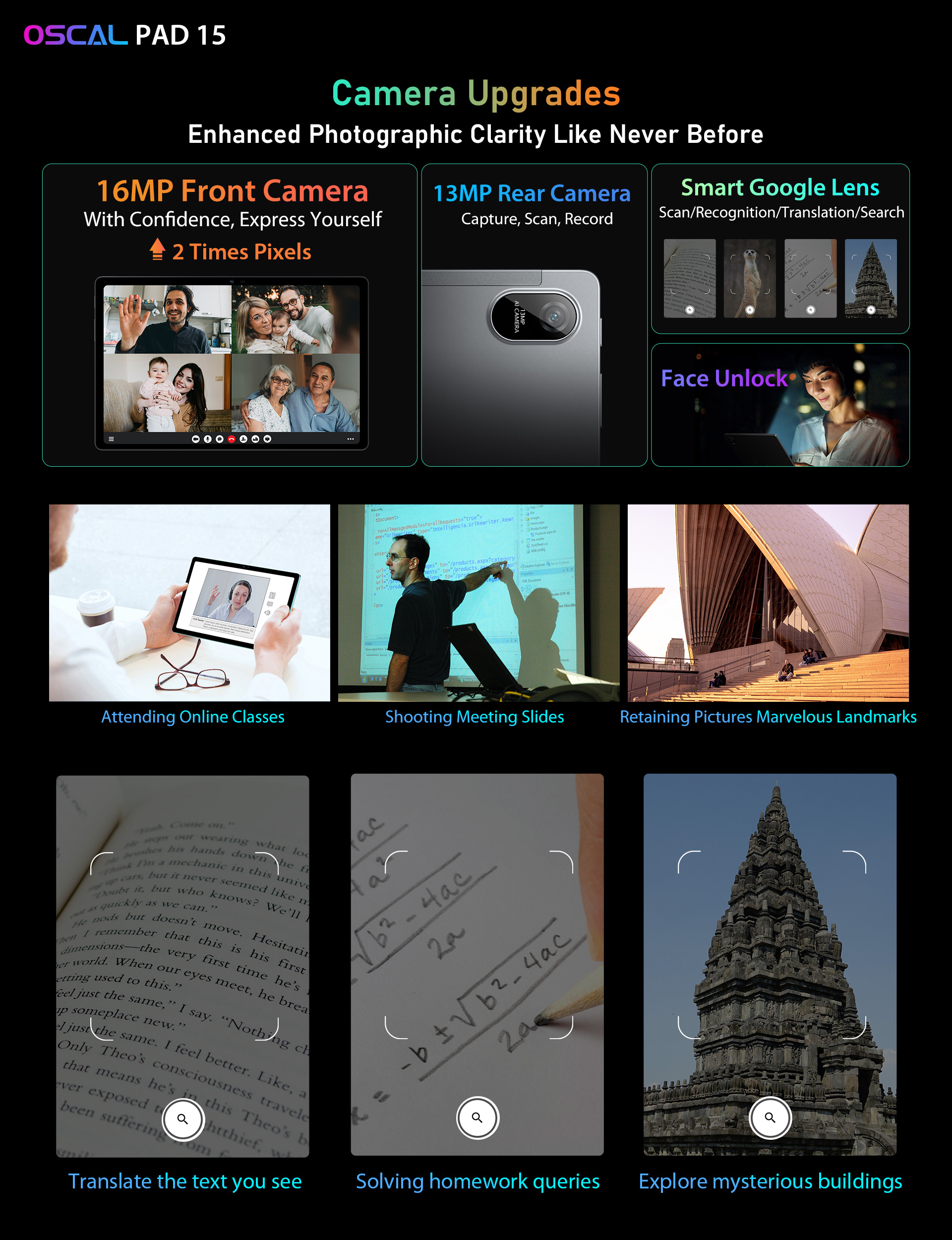 Díky upgradu z 8MP+13MP kamerového modulu na 16MP+13MP kamerový modul, ať už pro online konference nebo nahrávání keynote, přináší Oscal Pad 15 snímky s bohatšími detaily a jasnějším obrazem. Navíc díky několika vestavěným filtrům vykresluje Pad 15 kreativní prostory, ve kterých mohou uživatelé oživit svou fantazii. Video v rozlišení 1080p živě zaznamená každý okamžik – od poznámek ze třídy, přes slajdy na schůzkách až po váš každodenní život. Přední kamera zajišťuje bezproblémové odemykání s podporou rozpoznávání obličeje, čímž zajišťuje pohodlí i bezpečnost. Kromě toho je Oscal Pad 15 vybaven funkcí Smart Google Lens, která vám dále pomáhá při práci a studiu, včetně překladu, extrakce textu, rozpoznávání, řešení domácích dotazů a ještě více.