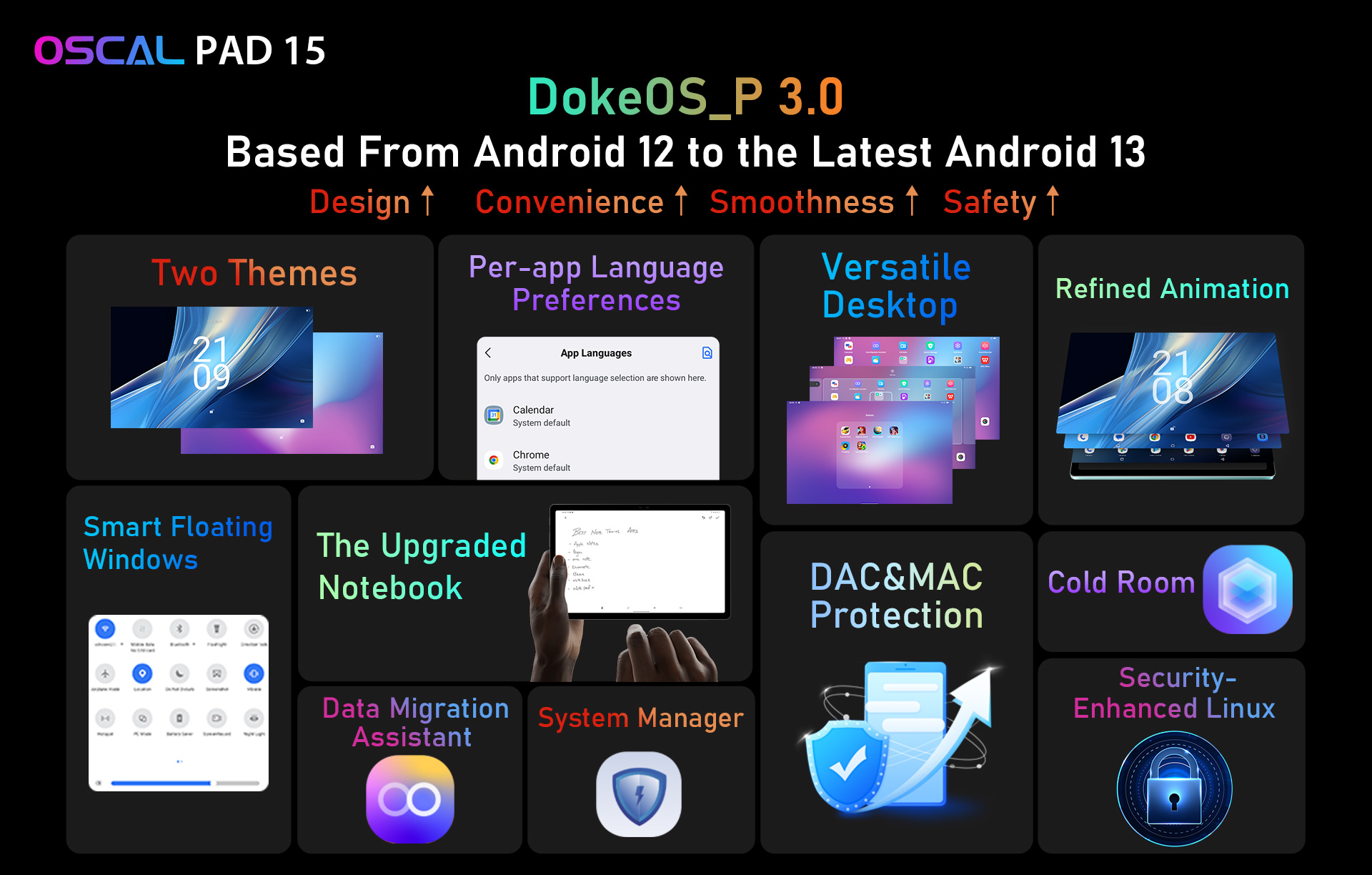V souladu s prvotřídní konfigurací využívá OSCAL Pad 15 systém DokeOS_P 3.0 založený na Androidu 13, který dále obohacuje každodenní život uživatelů a usnadňuje jim studium a práci díky osobnějšímu designu, uživatelsky přívětivějšímu rozhraní, ohleduplným nástrojům a užitečnější ochraně informací. Uživatelé si například mohou individuálně nastavit jazyk aplikace podle svých představ. Inteligentní plovoucí okna slouží k tomu, aby uživatelé dosáhli bezproblémové navigace pomocí jednoduchých tahů nahoru, dolů, doprava a doleva. Aby měli uživatelé klid na duši, OSCAL Pad 15 umisťuje všechny informace pod dvojitou ochranu DAC & MAC.